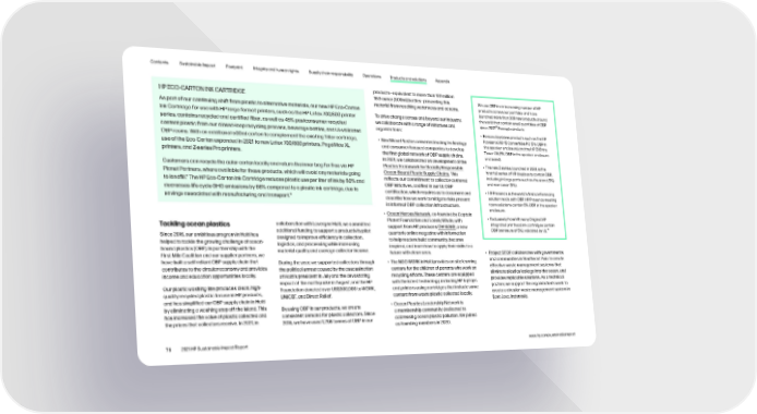 Contents Sustainable Impact Footprint Integrity and human rights Supply chain responsibility Operations Products and solutions Appendix products—equivalent to more than 102 million HP ECO-CARTON INK CARTRIDGE 16.9 ounce (500ml) bottles—preventing this We use OBP in an increasing number of HP As part of our continuing shift from plastic to alternative materials, our new HP Eco-Carton material from reaching waterways and oceans. products across our portfolio, and have launched more than 300 new products around Ink Cartridge for use with HP large format printers, such as the HP Latex 700/800 printer To drive change across and beyond our industry, the world that contain small quantities of OBP we collaborate with a range of initiatives and 43 series, contains recycled and certified fiber, as well as 45% postconsumer recycled since 2017. Examples include: content plastic from our closed-loop recycling process, beverage bottles, and UL-validated organizations: • Personal systems products such as the HP OBP resins. With an additional 500ml carton to complement the existing 1 liter cartridge, • NextWave Plastics convenes leading technology Pavilion x360 15 Convertible PC (5% OBP in use of the Eco-Carton expanded in 2021 to new Latex 700/800 printers, PageWide XL and consumer-focused companies to develop the speaker enclosure) and the HP Z1 Entry the first global network of OBP supply chains. Tower G8 (5% OBP in the speaker enclosure printers, and Z-series Pro printers. and bezel). In 2021, we collaborated on development of the Customers can recycle the outer carton locally and return the inner bag for free via HP Plastics Framework for Socially Responsible • The new Z series, launched in 2021, is the Planet Partners, where available for these products, which will avoid any materials going Ocean-Bound Plastic Supply Chains. This first full series of HP displays to contain OBP, reflects our commitment to collector-centered including in large parts such as the stand (5%) 41 and rear cover (5%). to landfill. The HP Eco-Carton Ink Cartridge reduces plastic use per liter of ink by 80% and OBP initiatives, codified in our UL OBP decreases life cycle GHG emissions by 66% compared to a plastic ink cartridge, due to certification, which requires us to document and • HP Presence is the world’s first conferencing 42 solution made with OBP. HP Presence meeting savings associated with manufacturing and transport. describe how we work to mitigate risks present in informal OBP collection infrastructure. room solutions contain 5% OBP in the speaker enclosure. • Ocean Heroes Network, co-founded by Captain Planet Foundation and Lonely Whale, with • Exclusively from HP, many Original HP Tackling ocean plastics collaboration with Lavergne Haiti, we committed support from HP, produces OH-WAKE, a new integrated printhead ink cartridges contain additional funding to support a productivity pilot OBP (minimum of 5%), validated by UL.44 Since 2016, our ambitious program in Haiti has quarterly online magazine with information helped to tackle the growing challenge of ocean- designed to improve efficiency in collection, to help readers build community, become bound plastics (OBP). In partnership with the logistics, and processing while increasing inspired, and learn how to apply their skills to a First Mile Coalition and our supplier partners, we material quality and average collector income. future with clean seas. • Project STOP collaborates with governments have built a self-reliant OBP supply chain that During the year, we supported collectors through • The NGO WORK in Haiti provides on-site learning and communities in Southeast Asia to create contributes to the circular economy and provides the political unrest caused by the assassination centers for the children of parents who work on effective waste management systems that income and education opportunities locally. of Haiti’s president in July and the devastating recycling efforts. These centers are equipped eliminate plastics leakage into the ocean, and impact of the earthquake in August, and the HP with the latest technology, including HP laptops provides replicable solutions. As a technical Our plastic washing line produces clean, high- Foundation donated over US$300,000 to WORK, and printers using cartridges that include some partner, we support the organization’s work to quality recycled plastic for use in HP products, UNICEF, and Direct Relief. content from waste plastic collected locally. create a circular waste management system in and has simplified our OBP supply chain in Haiti East Java, Indonesia. by eliminating a washing step off the island. This By using OBP in our products, we create • Ocean Plastics Leadership Network is has increased the value of plastic collected and consistent demand for plastic collectors. Since a membership community dedicated to the prices that collectors receive. In 2021, in 2016, we have used 1,298 tonnes of OBP in our addressing ocean plastic pollution. We joined as founding members in 2020. 78 2021 HP Sustainable Impact Report www.hp.com/sustainableimpact