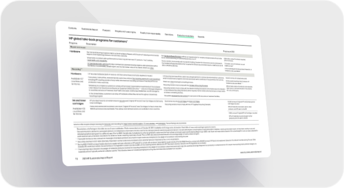 Contents Sustainable Impact Footprint Integrity and human rights Supply chain responsibility Operations Products and solutions Appendix HP global take-back programs for customers* Program Description Progress in 2021 Repair and reuse Hardware Our remanufacturing programs help to extend hardware lifespan, with the aim of reducing environmental Our Hardware Reuse Standard outlines our requirements for vendors and subvendors who provide 6.29 million units of hardware repaired impacts from replacing products that still have useful life. reuse, remanufacturing, or remarketing services for HP. (35,300 tonnes) We provide customers with guidance about how to repair their own HP products. See Durability, Reuse vendors must comply with the Media Handling Standard for information security (included in 2.15 million units of hardware reused repairability, and reusability. the Hardware Reuse Standard), which requires the full and documented erasure or destruction of all (7,200 tonnes)** HP Device Recovery Service provides commercial customers reverse logistics, data sanitization with a data-containing devices. 6.8% overall repair and reuse rate of relevant HP *** certificate, a sustainability benefit report, and the fair market value of the device. Watch our video. hardware sales worldwide Recycling**** Hardware HP recycles hardware (both HP and non-HP) that cannot be economically repaired or reused. HP Recycling Services offers custom recycling programs for commercial and enterprise customers, 108,800 tonnes of hardware recycled Consumers, home office, and commercial users have various free recycling options for used equipment, which include reverse logistics and data sanitization with a certificate if they purchase that service. 15.6% overall recycling rate of relevant HP Available in 67 ****** including HP recycling vendors that provide take-back and recycling services or free drop-off for our Watch our video showing the recycling process. hardware sales worldwide countries and products in many countries. Recycling vendors must comply with the Hardware Recycling Standard. 92% of total volume of products and materials territories We belong to compliance systems to comply with producer responsibility requirements of the European taken back in 2021 was reused or recycled by ***** Recycling vendors must comply with the Media Handling Standard for information security (included Union Waste from Electrical and Electronic Equipment (WEEE) Directive and end-of-life legal obligations in the Hardware Recycling Standard), which requires the full and documented erasure or destruction HP or by a third party in countries across our Americas, Asia Pacific and Japan, and Europe, Middle East, and Africa regions. of all data-containing devices. In the United States, customers can drop off hardware at Best Buy stores through our closed-loop We publish disassembly instructions for use by end-of-life recyclers or treatment facilities. recycling program. Ink and toner HP provides free and convenient ways to recycle used Original HP Ink and Toner Cartridges and Samsung See how we recycle ink cartridges and toner cartridges. 10,300 tonnes of Original HP and Samsung toner cartridges toner cartridges. Recycling vendors must comply with the HP Supplies Recycling Standard. cartridges recycled Home and commercial customers can return Original HP Ink and Toner Cartridges for free to more than 84% of materials recovered used in other Available in 68 18,500 authorized sites worldwide. Free pickup and mail-back options are available in most countries. products, and 0% went to landfill countries and territories 1,500 tonnes of Original HP Ink Cartridges recycled 67% of materials recovered used in other products, and 0% went to landfill We also offer responsible processing for batteries and recycling for large format media/supplies, 3D consumables, and packaging. These offerings vary by location. * Descriptions of offerings in this table are as of report publication. Performance data is as of October 31, 2021. Availability of offerings varies by location. View full list of reuse and recycling programs by country. ** Reused material is defined as recovered products or components of products that are used for the same purpose for which they were conceived. A reused product/part should replace a new product/part shipment, and the product/part needs to have been used by a user and refurbished before being sent to a different user. Prior to 2021, this data also included some units remarketed to customers that had not been previously used and refurbished. Beginning in 2021, most repair and reuse data is based on the actual weight for every product, adjusted for estimated amounts that were recycled or for which no issues requiring repair were found. Prior to 2021, data was estimated based on the average weight of each product category. *** The repair and reuse rate is based on the weight of hardware products returned for repair and reuse compared to the weight of our product sales during the year. **** Recycling volumes in 2021 were adversely impacted in some locations by lockdowns and customer behavior impacted by the COVID-19 pandemic. ***** During 2021, 41,600 tonnes of waste electronic equipment was collected on HP’s behalf to comply with producer responsibility requirements of the EU WEEE Directive, compared to 92,600 tonnes of HP electronic equipment placed on the relevant markets during the year. Data includes EU countries in which the authorities or the legislative system provide visibility of the recycling volume allocated to HP. Take-back volumes related to non-EU legislation are excluded. ****** The recycling rate is based on the weight of hardware products returned for recycling compared to the weight of our product sales from seven years ago (the estimated average lifespan of our products). It is impractical for HP to report the recycling rate by product category, as materials are not typically sorted at collection points. T