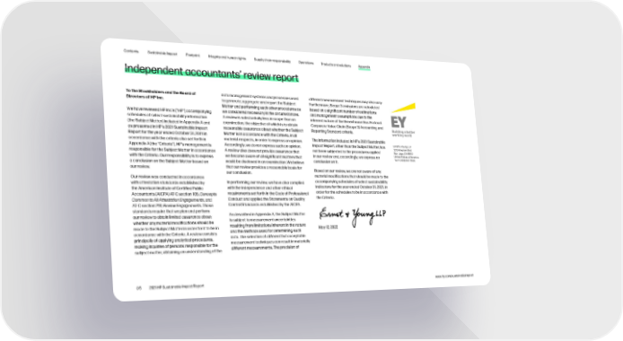 Contents Sustainable Impact Footprint Integrity and human rights Supply chain responsibility Operations Products and solutions Appendix Independent accountants’ review report To the Stockholders and the Board of data management systems and processes used different measurement techniques may also vary. Directors of HP Inc. to generate, aggregate and report the Subject Furthermore, Scope 3 emissions are calculated Matter and performing such other procedures as based on a significant number of estimations We have reviewed HP Inc.’s (“HP”) accompanying we considered necessary in the circumstances. and management assumptions due to the schedules of select sustainability information A review is substantially less in scope than an inherent nature of the Greenhouse Gas Protocol (the Subject Matter) included in Appendix A and examination, the objective of which is to obtain Corporate Value Chain (Scope 3) Accounting and as presented in HP’s 2021 Sustainable Impact reasonable assurance about whether the Subject Reporting Standard criteria. Report for the year ended October 31, 2021 in Matter is in accordance with the Criteria, in all accordance with the criteria also set forth in material respects, in order to express an opinion. The information included in HP’s 2021 Sustainable Accordingly, we do not express such an opinion. Impact Report, other than the Subject Matter, has Ernst & Young LLP Appendix A (the “Criteria”). HP’s management is not been subjected to the procedures applied 303 Almaden Blvd responsible for the Subject Matter in accordance A review also does not provide assurance that San Jose, CA 95110 we became aware of all significant matters that in our review and, accordingly, we express no United States of America with the Criteria. Our responsibility is to express conclusion on it. Tel: +1 (408) 947-5500 a conclusion on the Subject Matter based on would be disclosed in an examination. We believe our review. that our review provides a reasonable basis for Based on our review, we are not aware of any our conclusion. material modifications that should be made to the Our review was conducted in accordance accompanying schedules of select sustainability with attestation standards established by In performing our review, we have also complied the American Institute of Certified Public with the independence and other ethical indicators for the year ended October 31, 2021, in Accountants (AICPA) AT-C section 105, Concepts requirements set forth in the Code of Professional order for the schedules to be in accordance with Common to All Attestation Engagements, and Conduct and applied the Statements on Quality the Criteria. AT-C section 210, Review Engagements. Those Control Standards established by the AICPA. standards require that we plan and perform As described in Appendix A, the Subject Matter our review to obtain limited assurance about is subject to measurement uncertainties whether any material modifications should be resulting from limitations inherent in the nature made to the Subject Matter in order for it to be in and the methods used for determining such May 12, 2022 accordance with the Criteria. A review consists data. The selection of different but acceptable principally of applying analytical procedures, measurement techniques can result in materially making inquiries of persons responsible for the different measurements. The precision of subject matter, obtaining an understanding of the 95 2021 HP Sustainable Impact Report www.hp.com/sustainableimpact