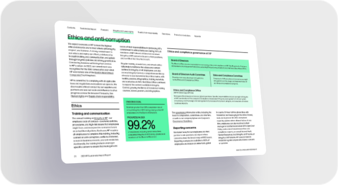 Contents Sustainable Impact Footprint Integrity and human rights Supply chain responsibility Operations Products and solutions Appendix Ethics and anti-corruption We expect everyone at HP to meet the highest aware of their responsibilities in reinforcing HP’s Ethics and compliance governance at HP ethical standards and to treat others with integrity, commitment to ethical behavior. During 2021, all respect, and fairness. A strong commitment to members of HP’s Board of Directors received our values underpins our efforts, reinforced by Integrity at HP content relevant to their positions, in-depth training and communication, and upheld and certified that they had read it. Board of Directors through targeted policies and strong governance. The Board of Directors is responsible for overseeing ethics and compliance at HP. Chip Bergh is the Chairman. Conducting business with integrity is central Regular training, newsletters, and virtual coffee All members are independent directors, excluding Enrique Lores, president and chief executive officer, HP Inc. to HP’s culture. In 2022, our commitment was talks help to reinforce the values and content recognized for the third consecutive year when outlined in Integrity at HP. Employees can also HP was named one of the World’s Most Ethical access Integrity Central, a comprehensive library Board of Directors Audit Committee Ethics and Compliance Committee Companies® by Ethisphere. of ready-to-use material on key ethics topics, with Provides non-executive input and guidance Composed of HP executives and provides oversight toolkits, posters, infographics, training materials, to the Ethics and Compliance Office. and guidance on the design and implementation of HP is committed to complying with all applicable and scenarios. In 2021, the Ethics Office continued our ethics and compliance program. laws and regulations everywhere we operate. We to expand the content available in Integrity also require ethical conduct by our suppliers and Central, growing the library of translated training Ethics and Compliance Office partners and use our scale and influence to drive courses, videos, posters, and infographics. (within Global Legal Affairs) progress across the broader IT industry. See Manages ethical issues across our global operations. Specific responsibilities include oversight of Integrity Human rights and Supply chain responsibility. at HP, coordination of the company’s Compliance Assessment Program, management of anti-corruption ONGOING GOAL and privacy, and the design and management of processes that prevent, mitigate, and remediate all related Ethics business impacts. Maintain greater than 99% completion rate of annual Integrity at HP training among active HP Training and communication employees and the Board of Directors See governance information online, including the in-country 24-hour toll-free phone lines with PROGRESS IN 2021 board’s composition, committees, and charters, translation, text messaging (in the United States), The annual training on Integrity at HP—our as well as our company bylaws and Corporate mail, and in person. We offer anonymous employee code of conduct—covers key policies, Governance Guidelines. reporting options where allowed by law. At any procedures, and high-risk issues that employees time, employees can also reach out to their might face, and incorporates scenarios based 99.2% Reporting concerns manager or another leader under HP’s Open Door on actual investigations. Each year, HP requires of employees, including senior executives, Policy, seek advice from internal ethics and all employees to complete this training, including completed Integrity at HP training, as well as all We make it easy for our employees and third compliance experts, or consult Internal Audit, content on anti-corruption, conflicts of interest, members of the Board of Directors1 parties to ask questions and report ethics Human Resources, local Integrity at HP teams, or accurate business records, and anti-retaliation. concerns about the broad range of ESG issues. Integrity at HP liaisons. HP does not tolerate Additionally, the training includes manager- Reporting avenues are available to 100% of retaliation against anyone who raises a concern specific content to ensure that managers are employees and include an online form, global or question. 21 2021 HP Sustainable Impact Report www.hp.com/sustainableimpact