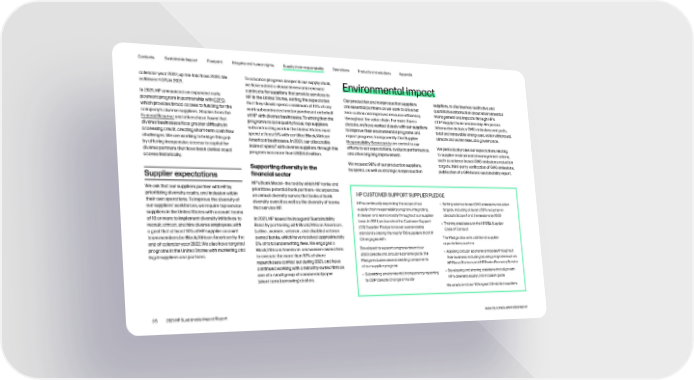 Contents Sustainable Impact Footprint Integrity and human rights Supply chain responsibility Operations Products and solutions Appendix calendar year 2022, up ten-fold from 2020. We To advance progress deeper in our supply chain, Environmental impact achieved 4.5% in 2021. we have added a clause in new and renewed contracts for suppliers that provide services to In 2021, HP announced an expanded early HP in the United States, setting the expectation Our production and nonproduction suppliers suppliers, to disclose key qualitative and payment program in partnership with C2FO, that they should spend a minimum of 10% of any are essential partners as we work to drive net quantitative information about environmental which provides broad access to funding for the work subcontracted and/or purchased on behalf zero carbon and improved resource efficiency management and impacts through HP’s company’s diverse suppliers. Studies from the of HP with diverse businesses. To strengthen the throughout the value chain. For more than a CDP Supply Chain membership. Requested Federal Reserve and others have found that program’s racial equality focus, top suppliers decade, we have worked closely with our suppliers information includes GHG emissions and goals, diverse businesses face greater difficulty in subcontracting work in the United States must to improve their environmental programs and total and renewable energy use, water withdrawal, accessing credit, creating short-term cash flow spend at least 5% with certified Black/African report progress transparently. Our Supplier climate and water risks, and governance. challenges. We are working to bridge this gap American businesses. In 2021, our allocatable Responsibility Scorecards are central to our by offering inexpensive access to capital for indirect spend2 efforts to set expectations, evaluate performance, We periodically raise our expectations relating with diverse suppliers through this to supplier environmental management criteria, diverse partners that have been denied equal program was more than US$350 million. and drive ongoing improvement. access historically. such as science-based GHG emissions-reduction Supporting diversity in the We request 98% of our production suppliers, targets, third-party verification of GHG emissions, by spend, as well as strategic nonproduction publication of a GRI-based sustainability report, Supplier expectations financial sector HP’s Bank Model—the tool by which HP ranks and We ask that our suppliers partner with HP by prioritizes potential bank partners—incorporates prioritizing diversity, equity, and inclusion within an annual diversity survey that looks at bank HP CUSTOMER SUPPORT SUPPLIER PLEDGE their own operations. To improve the diversity of diversity overall as well as the diversity of teams HP is continually expanding the scope of our • Setting science-based GHG emissions reduction our suppliers’ workforces, we require top service that service HP. supply chain responsibility program, integrating targets, including at least a 50% reduction in suppliers in the United States with account teams it deeper and more broadly throughout our supplier absolute Scope 1 and 2 emissions by 2030 of 10 or more to implement diversity initiatives to In 2021, HP issued its inaugural Sustainability base. In 2021, we launched the Customer Support recruit, attract, and hire diverse employees, with Bond by partnering with Black/African American-, • Training employees on the HP RBA Supplier a goal that at least 10% of HP supplier account Latino-, women-, veteran-, and disabled veteran- (CS) Supplier Pledge to boost sustainability Code of Conduct team members be Black/African American by the owned banks, which have received approximately standards among the nearly 700 suppliers that HP CS engages with. The Pledge also sets additional supplier end of calendar year 2022. We also have targeted 5% of total underwriting fees. We engaged a expectations, such as: programs in the United States with marketing and Black/African American- and women-owned firm Developed to support progress toward our legal suppliers and partners. to execute the more than 10% of share 2030 climate and circular economy goals, the • Applying circular economy principles throughout repurchases carried out during 2021, and have Pledge includes several existing components their business, including by using programs such as continued working with a minority-owned firm as of our supplier program: HP Planet Partners and HP Device Recovery Service one of a small group of commercial paper • Submitting environmental transparency reporting • Developing and sharing ambitions that align with (short-term borrowing) dealers. to CDP Climate Change annually HP’s diversity, equity, and inclusion goals We aim to enrol our 50 largest CS-related suppliers. 35 2021 HP Sustainable Impact Report www.hp.com/sustainableimpact