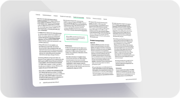 Contents Sustainable Impact Footprint Integrity and human rights Supply chain responsibility Operations Products and solutions Appendix • We joined the 2021 CDP Science-Based More broadly, through CDP, our production We engaged 98% of our first-tier production We require our product transportation suppliers Targets Campaign and co-signed a letter to a suppliers reported savings of 20 million tonnes of suppliers, by spend, to help reduce their to use the Global Logistics Emissions Council large number of companies—including many COe and US$465 million from reduction initiatives environmental impact. Overall, 95% (by spend) Framework to provide standardized calculations 2 in our supply chain—urging them to set SBTi- 5 reported having GHG emissions-reduction- and data that account for variation in different implemented in 2020. This demonstrates the validated GHG emissions-reduction goals. By scale of ongoing GHG emissions-reduction related goals, and 31% reported science-based locations. To drive progress across the industry the end of 2021, nine of those suppliers had a activities throughout our production supply chain, targets (13% validated by the SBTi and 18% and beyond, we are working with the Clean Cargo new target in place, including four with a net regardless of whether driven by HP’s engagement. evaluated by HP). We also encourage suppliers Working Group, the Smart Freight Centre, the zero commitment. to use renewable energy. Seventy-seven percent International Council on Clean Transportation, • To support local demand for renewable energy reported doing so in 2021, by spend, with 71% and the U.S. Environmental Protection Agency in countries where some of our suppliers are reporting renewable energy use goals, up from (EPA) SmartWay program. based, we worked with the U.S. Department HP uses 100% renewable electricity to power 70% the prior year. the final assembly of over 95% of our PC and We continue to use SmartWay partners as a first of State through the Clean Energy Demand display products worldwide6 Product transportation choice for 100% of our products shipped by truck Initiative to produce letters of intent with 7 in the United States and Canada. The program those countries, which were presented at the Approach aims to help improve road transportation COP26 conference. To improve efficiency, cut costs, and reduce efficiency and reduce GHG and other emissions. • Along with seven of our suppliers, we Performance negative environmental impacts, we work to In 2021, HP won the U.S. EPA SmartWay Excellence participated in roundtable discussions In 2020, the most recent year for which data is optimize our logistics network by consolidating Award for the eighth year in a row, demonstrating hosted by WWF Climate Business Hub, with available, the suppliers that make HP products shipments, identifying new routes, and shipping leadership in freight supply chain energy and representatives from the Chinese government generated 2.7 million tonnes of Scope 1 and directly to customers or local distribution environmental performance for the “Large and renewable energy developers, to promote Scope 2 CO e emissions attributable to HP, 8% centers. To drive progress, in 2021 we held GHG Shipper” category in the United States. During policies that will enable greater renewable 2 emissions-reduction workshops with about the year, we joined the Sustainable Freight electricity sourcing in Jiangsu Province. less than in 2019. 20 suppliers representing more than 90% of Buyers Alliance to decarbonize freight and create This reflects the impact of supplier energy- our CO e emissions in this area. Sustainability demand for low and zero emissions across all Our Energy Efficiency Program in China and 2 modes of transport. Southeast Asia, implemented in collaboration with conservation measures and GHG emissions- topics are also discussed during our quarterly NGOs such as BSR, Natural Resources Defense reduction projects, increased renewable executive-level meetings with these same Reducing packaging size and weight also has Council (NRDC), the World Resources Institute, energy use, and investment in power purchase suppliers, to promote a focus on environmental the potential to decrease GHG emissions and WWF, helps suppliers to build capabilities, agreements. Facility closures caused by topics and encourage them to set related associated with product transportation. See identify ways to improve energy efficiency, and COVID-19 also reduced emissions. The intensity of performance goals. Packaging innovation. explore the use of renewable energy. GHG emissions per HP annual revenue decreased HP is participating in several pilot programs to in 2020 by 9% compared to 2015. explore opportunities to reduce GHG emissions Performance Since 2010, we estimate that participants in this from logistics, for example Maersk’s project with Product transportation resulted in 1.62 million and other programs have avoided 1.46 million industry leaders to scale zero carbon solutions tonnes of CO e emissions in 2021, up 7% from tonnes of CO 4 2 2e emissions and saved a cumulative for ocean transport, such as the use of carbon the prior year. This was due primarily to product 992 million kWh (US$119 million) of electricity, neutral e-methanol or sustainable bio-methanol. volume increases as well as improved data for including 81,000 tonnes of CO e emissions and 2 emissions related to road (including rail). 31 million kWh (US$3.9 million) in 2021. 37 2021 HP Sustainable Impact Report www.hp.com/sustainableimpact