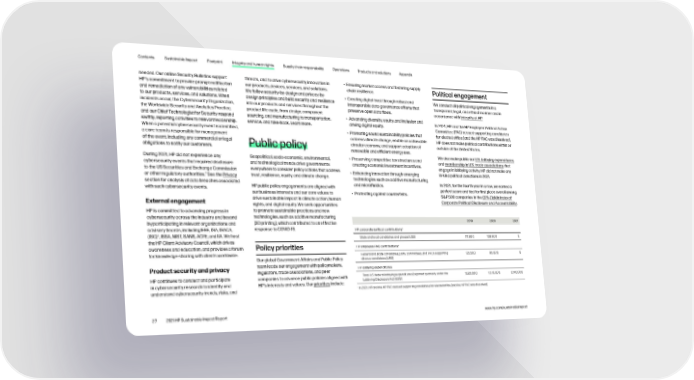 Contents Sustainable Impact Footprint Integrity and human rights Supply chain responsibility Operations Products and solutions Appendix needed. Our online Security Bulletins support threats, and to drive cybersecurity innovation in • Ensuring market access and fostering supply Political engagement HP’s commitment to provide prompt notification our products, devices, services, and solutions. chain resilience. and remediation of any vulnerabilities related We follow security-by-design and privacy-by- • Creating digital trust through robust and We conduct all political engagements in a to our products, services, and solutions. When design principles and build security and resilience interoperable data-governance efforts that transparent, legal, and ethical manner and in incidents occur, the Cybersecurity Organization, into our products and services throughout the preserve open data flows. accordance with Integrity at HP. the Worldwide Security and Analytics Practice, product life cycle, from design, component and our Chief Technologist for Security respond sourcing, and manufacturing to transportation, • Advancing diversity, equity, and inclusion and In 2021, HP and the HP Employee Political Action swiftly, reporting activities to relevant leadership. service, and take-back. Learn more. driving digital equity. Committee (PAC) ceased supporting candidates When a potential cybersecurity event is identified, • Promoting sound sustainability policies that for elected office (and the HP PAC was dissolved). a core team is responsible for management address climate change, enable an achievable HP does not make political contributions within or of the event, including any commercial or legal Public policy circular economy, and support adoption of outside of the United States. obligations to notify our customers. renewable and efficient energy use. During 2021, HP did not experience any Geopolitical, socio-economic, environmental, • Preserving competitive tax structures and We also make public our U.S. lobbying expenditures cybersecurity events that required disclosure and technological trends drive governments creating economic investment incentives. and membership in U.S. trade associations that to the US Securities and Exchange Commission everywhere to consider policy actions that address engage in lobbying activity. HP did not make any • Enhancing innovation through emerging in-kind political donations in 2021. or other regulatory authorities.2 trust, resilience, equity, and climate change. See the Privacy technologies such as additive manufacturing section for analysis of data breaches associated and microfluidics. In 2021, for the fourth year in a row, we earned a with such cybersecurity events. HP public policy engagements are aligned with perfect score and tied for first place overall among our business interests and our core values to • Protecting against counterfeits. S&P 500 companies in the CPA-Zicklin Index of External engagement drive sustainable impact in climate action, human Corporate Political Disclosure and Accountability. rights, and digital equity. We seek opportunities HP is committed to advancing progress in to promote sustainable practices and new cybersecurity across the industry and beyond technologies, such as additive manufacturing by participating in relevant organizations and (3D printing), which contributed to an effective 2019 2020 2021 advisory boards, including IEEE, ISA, ISACA, response to COVID-19. HP corporate political contributions* (ISC)2, ISSA, NIST, SANS, ACFE, and IIA. We host State and local candidates and groups [US$] 111,900 138,900 0 the HP Client Advisory Council, which drives awareness and education, and provides a forum Policy priorities HP employee PAC contributions* for knowledge-sharing with clients worldwide. Federal and state candidates, party committees, and PACs supporting 85,500 95,000 0 Our global Government Affairs and Public Policy diverse candidates [US$] Product security and privacy team leads our engagement with policymakers, HP lobbying expenditures regulators, trade associations, and peer HP continues to conduct and participate companies to advance public policies aligned with Total U.S. federal lobbying expenditures (reported quarterly under the 1,620,000 1,570,000 2,140,000 in cybersecurity research to identify and HP’s interests and values. Our priorities include: Lobbying Disclosure Act) [US$] understand cybersecurity trends, risks, and * In 2021, HP and the HP PAC ceased supporting candidates for elected office (and the HP PAC was dissolved). 27 2021 HP Sustainable Impact Report www.hp.com/sustainableimpact