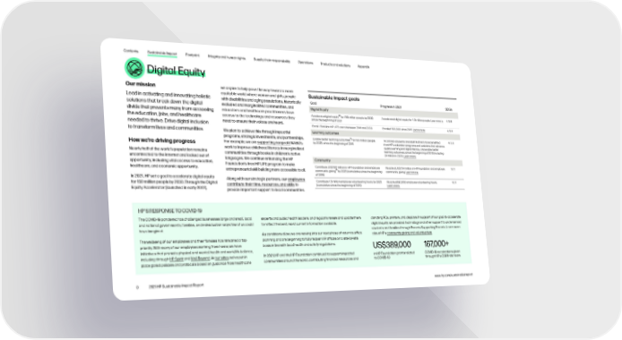 Contents Sustainable Impact Footprint Integrity and human rights Supply chain responsibility Operations Products and solutions Appendix Digital Equity Our mission we aspire to help pave the way toward a more Sustainable Impact goals Lead in activating and innovating holistic equitable world where women and girls, people with disabilities and aging populations, historically Goal Progress in 2021 SDGs solutions that break down the digital excluded and marginalized communities, and Digital Equity divide that prevents many from accessing educators and healthcare practitioners have 23 access to the technology and resources they Accelerate digital equity for 150 million people by 2030, Accelerated digital equity for 4.3 million people. Learn more. 4, 5, 8 the education, jobs, and healthcare since the beginning of 2021 needed to thrive. Drive digital inclusion need to ensure their voices are heard. Enroll 1.5 million HP LIFE users between 2016 and 2030 Enrolled 533,000 since 2016. Learn more. 4, 5, 8 to transform lives and communities. We plan to achieve this through impactful Learning outcomes programs, strategic investments, and partnerships. Enable better learning outcomes24 for 100 million people 74.3 million students and adult learners have benefited 4, 5, 8 How we’re driving progress For example, we are supporting nonprofit NABU’s by 2025, since the beginning of 2015 from HP’s education programs and solutions that advance work to improve childhood literacy in marginalized quality learning and digital literacy, and enable better Nearly half of the world’s population remains learning outcomes, since the beginning of 2015 (including communities through books in children’s native 24 million in 2021). Learn more. unconnected to the internet and locked out of languages. We continue enhancing the HP Community opportunity, including vital access to education, Foundation’s free HP LIFE program to make healthcare, and economic opportunity. Contribute US$100 million in HP Foundation and employee Reached US$73.4 million in HP Foundation and employee 11, 17 entrepreneurial skill building more accessible to all. community giving25 community giving. Learn more. by 2025 (cumulative since the beginning In 2021, HP set a goal to accelerate digital equity of 2016) Along with our strategic partners, our employees Contribute 1.5 million employee volunteering hours by 2025 Reached 692,000 employee volunteering hours. 11, 17 for 150 million people by 2030. Through the Digital contribute their time, resources, and skills to (cumulative since the beginning of 2016) Learn more. Equity Accelerator (launched in early 2022), provide important support to local communities. HP’S RESPONSE TO COVID-19 The COVID-19 pandemic has challenged businesses large and small, local experts and public health leaders, and regularly review and update them donating PCs, printers, and displays. In support of our goal to accelerate and national governments, families, and individuals in ways few of us could to reflect the best, most current information available. digital equity, we provided technology and other support to underserved have imagined. students and families through Parents Supporting Parents. Learn more As conditions allow, we are moving into our next phase of return to office about HP’s community giving and volunteerism. The wellbeing of our employees and their families has remained a top planning and are beginning to fully reopen HP offices on a site-by-site priority. With many of our employees working from home, we have basis in line with local health and safety regulations. US$389,000 167,000+ initiatives that promote physical and mental health and work/life balance, including through HP Spirit and Well Beyond. At our sites, we’ve put in In 2021, HP and the HP Foundation continued to support impacted in HP Foundation grants related COVID-19 vaccinations given place global policies and protocols based on guidance from healthcare communities around the world, contributing financial resources and to COVID-19 through HP’s CSR India team 9 2021 HP Sustainable Impact Report www.hp.com/sustainableimpact