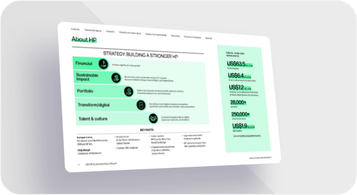 Contents Sustainable Impact Footprint Integrity and human rights Supply chain responsibility Operations Products and solutions Appendix About HP FISCAL YEAR 2021 HIGHLIGHTS STRATEGY: BUILDING A STRONGER HP US$63.5 BILLION Financial Achieve significant value growth in net revenue US$6.4 BILLION Sustainable Become the most sustainable and just IT company; of net cash provided by operations Impact focus on Climate Change, Human Rights, and Digital Equity US$7.2 BILLION Portfolio Build a more growth-oriented portfolio, while we continue returned to stockholders in the form to lead decisively in our core businesses of share repurchases and dividends Becoming a more digital company to streamline 28,000+ Transform/digital operations and enable new customer value propositions patents2 250,000+ Talent & culture A school for leaders built on Agility, channel partners Customer Centricity, and Ambition KEY FACTS US$1.9 BILLION R&D spend Enrique Lores • Incorporated • Ticker symbol • Approximately 51,000 See our full financial performance. 1 President and Chief Executive in the State of Delaware, HPQ on the New York employees globally Officer, HP Inc. United States Stock Exchange • HP operates in more than Chip Bergh • Fortune 100 company • Corporate headquarters 180 countries worldwide Chairman of the Board Palo Alto, California, United States 4 2021 HP Sustainable Impact Report www.hp.com/sustainableimpact