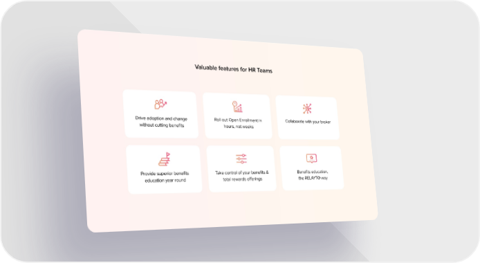 Drive adoption and change without cutting benefits Roll out Open Enrollment in hours, not weeks Collaborate with your broker Provide superior benefits education year round Take control of your benefits & total rewards offerings Benefits education, the RELAYTO way Valuable features for HR Teams