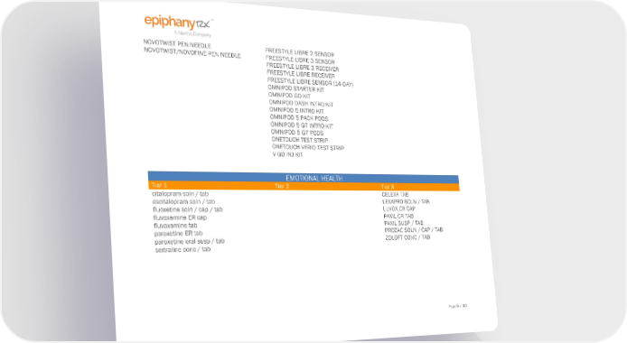 NOVOTWIST PEN NEEDLE FREESTYLE LIBRE 2 SENSOR NOVOTWIST/NOVOFINE PEN NEEDLE FREESTYLE LIBRE 3 SENSOR FREESTYLE LIBRE 3 RECEIVER FREESTYLE LIBRE RECEIVER FREESTYLE LIBRE SENSOR (14-DAY) OMNIPOD STARTER KIT OMNIPOD GO KIT OMNIPOD DASH INTRO KIT OMNIPOD 5 INTRO KIT OMNIPOD 5 PACK PODS OMNIPOD 5 G7 INTRO KIT OMNIPOD 5 G7 PODS ONETOUCH TEST STRIP ONETOUCH VERIO TEST STRIP V-GO INJ KIT EMOTIONAL HEALTH Tier 1 Tier 2 Tier 3 citalopram soln / tab CELEXA TAB escitalopram soln / tab LEXAPRO SOLN / TAB fluoxetine soln / cap / tab LUVOX CR CAP fluvoxamine ER cap PAXIL CR TAB fluvoxamine tab PAXIL SUSP / TAB paroxetine ER tab PROZAC SOLN / CAP / TAB paroxetine oral susp / tab ZOLOFT CONC / TAB sertraline conc / tab Page 5 of 10