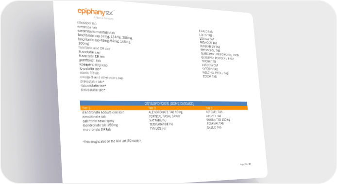 colestipol tab LIVALO TAB ezetimibe tab LOPID TAB ezetimibe/simvastatin tab LOVAZA CAP fenofibrate cap 67mg, 134mg, 200mg MEVACOR TAB fenofibrate tab 48mg, 54mg, 145mg, NIASPAN ER TAB 160mg PRAVACHOL TAB fenofibric acid DR cap QUESTRAN LITE POWDER / PACK fluvastatin cap QUESTRAN POWDER / PACK fluvastatin ER tab TRICOR TAB gemfibrozil tab VASCEPA CAP icosapent ethyl cap VYTORIN TAB lovastatin tab* WELCHOL PACK / TAB niacin ER tab ZOCOR TAB omega-3-acid ethyl esters cap pravastatin tab* rosuvastatin tab* simvastatin tab* OSTEOPOROSIS (BONE DISEASE) Tier 1 Tier 2 Tier 3 alendronate sodium oral soln ALENDRONATE TAB 40mg ACTONEL TAB alendronate tab FORTICAL NASAL SPRAY ATELVIA TAB calcitonin nasal spray NATPARA INJ BONIVA TAB 150mg ibandronate tab 150mg TERIPARATIDE INJ FOSAMAX TAB risedronate DR tab TYMLOS INJ SKELID TAB *This drug is also on the ACA List ($0 copay). Page 10 of 10