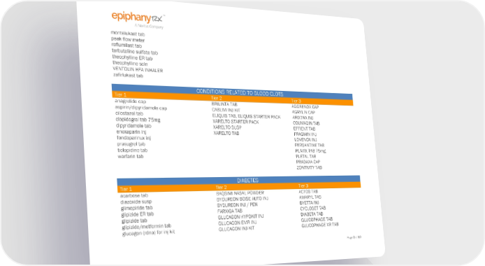 montelukast tab peak flow meter roflumilast tab terbutaline sulfate tab theophylline ER tab theophylline soln VENTOLIN HFA INHALER zafirlukast tab CONDITIONS RELATED TO BLOOD CLOTS Tier 1 Tier 2 Tier 3 anagrelide cap BRILINTA TAB AGGRENOX CAP aspirin/dipyridamole cap CABLIVI INJ KIT AGRYLIN CAP cilostazol tab ELIQUIS TAB, ELIQUIS STARTER PACK ARIXTRA INJ clopidogrel tab 75mg XARELTO STARTER PACK COUMADIN TAB dipyridamole tab XARELTO SUSP EFFIENT TAB enoxaparin inj XARELTO TAB FRAGMIN INJ fondaparinux inj LOVENOX INJ prasugrel tab PERSANTINE TAB ticlopidine tab PLAVIX TAB 75mg warfarin tab PLETAL TAB PRADAXA CAP ZONTIVITY TAB DIABETES Tier 1 Tier 2 Tier 3 acarbose tab BAQSIMI NASAL POWDER ACTOS TAB diazoxide susp BYDUREON BCISE AUTO INJ AMARYL TAB glimepiride tab BYDUREON INJ / PEN BYETTA INJ glipizide ER tab FARXIGA TAB CYCLOSET TAB glipizide tab GLUCAGON HYPOKIT INJ DIABETA TAB glipizide/metformin tab GLUCAGON EMR INJ GLUCOPHAGE TAB glucagon (rdna) for inj kit GLUCAGON INJ KIT GLUCOPHAGE XR TAB Page 2 of 10