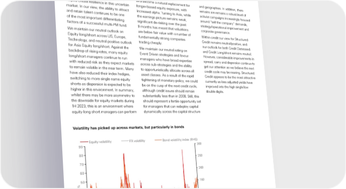 Global Private Banking return streams have worked well and and become a natural replacement for and geographies. In addition, there helped create resilience in this uncertain longer-biased equity exposure, with remains are remains a robust level of market. In our view, the ability to attract increased alpha. Turning to Asia, while activist campaigns increasingly focused and retain talent continues to be one the earnings picture remains weak, around “sell the company” demands, of the most important differentiating significant de-risking over the past strategy/operational improvement and factors of a successful multi-PM fund. 9 months has meant that valuations corporate governance. We maintain our neutral outlook on are below fair value with a number of Within credit our view for Structured Equity long/short across US, Europe, fundamentally strong companies Credit remains neutral/positive, and Technology, and neutral positive outlook trading cheaply. our outlook for both Credit Distressed for Asia Equity long/short. Against the We maintain our neutral rating on and Credit Long/short remains neutral. backdrop of rising rates, many equity Event Driven strategies and favour However, considerable improvements in long/short managers continue to run managers who have broad expertise spread, carry and dispersion continue to with reduced risk as they expect markets across sub-strategies and the ability get our attention as we believe the next to remain volatile in the near term. Many to opportunistically allocate across all credit cycle may be nearing. Structured have also reduced their index hedges, asset classes. As a result of the rapid Credit appears to be the most attractive switching to more single name equity tightening of monetary policy, we could currently as loss adjusted yields have shorts as dispersion is expected to be be on the cusp of the next credit cycle, improved into the high single/low higher in this environment. In summary, although credit issues should remain double digits. whilst there may be more asymmetry to substantially less than in 2008. Still, this the downside for equity markets during should represent a fertile opportunity set 1H 2023, this is an environment where for managers that can redeploy capital equity long short managers can perform dynamically across the capital structure Volatility has picked up across markets, but particularly in bonds Equity volatility FX volatility Bond volatility index (R 90 300 80 250 70 60 200 50 % 150 40 30 100 20 50 10 0 0 2002 2004 2006 2008 2010 2012 2014 2016 2018 2020 2022 Source: Bloomberg, HSBC Global Private Banking as at 22 November 2022. Past performance is not a reliable indicator of future performance. 35