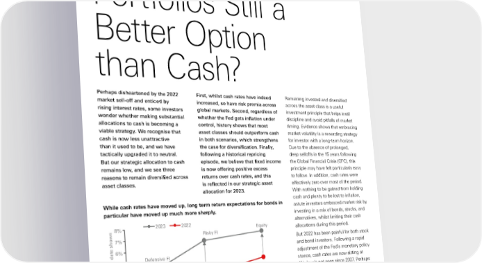 Global Private Banking Investment Outlook Report Are Diversified Portfolios Still a Better Option than Cash? Perhaps disheartened by the 2022 First, whilst cash rates have indeed Remaining invested and diversified market sell-off and enticed by increased, so have risk premia across across the asset class is a useful rising interest rates, some investors global markets. Second, regardless of investment principle that helps instil wonder whether making substantial whether the Fed gets inflation under discipline and avoid pitfalls of market allocations to cash is becoming a control, history shows that most timing. Evidence shows that embracing viable strategy. We recognise that asset classes should outperform cash market volatility is a rewarding strategy cash is now less unattractive in both scenarios, which strengthens for investor with a long-term horizon. than it used to be, and we have the case for diversification. Finally, Due to the absence of prolonged, tactically upgraded it to neutral. following a historical repricing deep selloffs in the 15 years following But our strategic allocation to cash episode, we believe that fixed income the Global Financial Crisis (GFC), this remains low, and we see three is now offering positive excess principle may have felt particularly easy reasons to remain diversified across returns over cash rates, and this to follow. In addition, cash rates were asset classes. is reflected in our strategic asset effectively zero over most of the period. allocation for 2023. With nothing to be gained from holding cash and plenty to be lost to inflation, While cash rates have moved up, long term return expectations for bonds in astute investors embraced market risk by particular have moved up much more sharply. investing in a mix of bonds, stocks, and 2023 2022 alternatives, whilst limiting their cash 8% Equity allocations during this period. Risky FI 7% But 2022 has been painful for both stock 6% and bond investors. Following a rapid Defensive FI adjustment of the Fed’s monetary policy 5% stance, cash rates are now sitting at 4% 4%, levels not seen since 2007. Perhaps Cash disheartened by the recent sell-off and 3% enticed by higher interest rates, some te€ etuns f€ ate sh‚n2% investors wonder whether cash has 1% become a more attractive proposition than it used to be. We sympathise 0% with this view, mainly on the basis that Exete n0% 2% 4% 6% 8% 10% 12% 14% 16% 18% the regime of financial repression is Exete vatiity probably behind us, and we may again Source: HSBC Global Asset Management, HSBC Private Banking, 22 November 2022. Defensive FI: Government see a regime where cash returns begin Bonds, Corporate Credit, Securitised Credit and Inflation-linked Bonds. Risky FI: High Yield and Emerging Market to outpace inflation again (in the US, Debt. Equities: Developed and Emerging equities. All expected returns are shown in USD. 12