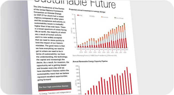 Global Private Banking Investment Outlook Report Investing for a Sustainable Future The 27th Conference of the Parties Projected annual investment in energy storage of the United Nations Framework Convention on Climate Change 70 APAC EMEA Americas Rest o or (or COP 27 for short) had a raised urgency compared to other years 60 and the acceptance and activity on 50 sustainability issues is markedly higher than it has ever been. There 40 is a broad spectrum of crises facing life on earth, the majority of which USD bn30 are a result of human activity and it is now widely accepted 20 that we need to move quickly to limit the impact of our historic 10 mistakes. The good news is that 0 we have everything we need to 2018 2020 2022 2024 2026 2028 2030 2032 2034 2036 2038 2040 get to where we need to be in 2019 2021 2023 2025 2027 2029 2031 2033 2035 2037 2039 terms of sustainability: we have Source: Bloomberg Finance L.P. HSBC Global Private Banking, 22 November 2022. the understanding, the technology, the capital and increasingly the desire. As a result, for investors, the Annual Renewable Energy Capacity Pipeline opportunity set is getting deeper 450 and broader every day and we have identified 4 themes within the 400 sustainability trend that we believe 350 represent excellent opportunities 300 going forward. 250 200 Our four high conviction themes USD bn150 1. Energy Transition and Independence 100 2. Financing Biodiversity Action 50 3. Sourcing Income in a 0 Sustainable Way 2004 2006 2008 2010 2012 2014 2016 2018 2020 Q3 2022 4. The Rise of S in ESG 2005 2007 2009 2011 2013 2015 2017 2019 2021 Source: Bloomberg New Energy Finance (BNEF), HSBC Global Research, HSBC Global Private Banking as at 22 November 2022 22