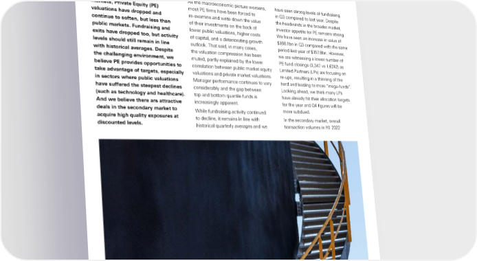 Global Private Banking Investment Outlook Report Private Markets Amid sharp declines in public As the macroeconomic picture worsens, have seen strong levels of fundraising markets, Private Equity (PE) most PE firms have been forced to in Q3 compared to last year. Despite valuations have dropped and re-examine and write down the value the headwinds in the broader market, continue to soften, but less than of their investments on the back of investor appetite for PE remains strong. public markets. Fundraising and lower public valuations, higher costs We have seen an increase in value of exits have dropped too, but activity of capital, and a deteriorating growth $166.1bn in Q3 compared with the same levels should still remain in line outlook. That said, in many cases, period last year of $157.9bn. However, with historical averages. Despite the valuation compression has been we are witnessing a lower number of the challenging environment, we muted, partly explained by the lower PE fund closings (3,347 vs 1,6242) as believe PE provides opportunities to correlation between public market equity Limited Partners (LPs) are focusing on take advantage of targets, especially valuations and private market valuations. re-ups, resulting in a thinning of the in sectors where public valuations Manager performance continues to vary herd and leading to more “mega-funds”. have suffered the steepest declines considerably and the gap between Looking ahead, we think many LPs (such as technology and healthcare). top and bottom quartile funds is have already hit their allocation targets And we believe there are attractive increasingly apparent. for the year and Q4 figures will be deals in the secondary market to While fundraising activity continued more subdued. acquire high quality exposures at to decline, it remains in line with In the secondary market, overall discounted levels. historical quarterly averages and we transaction volumes in H1 2022 36