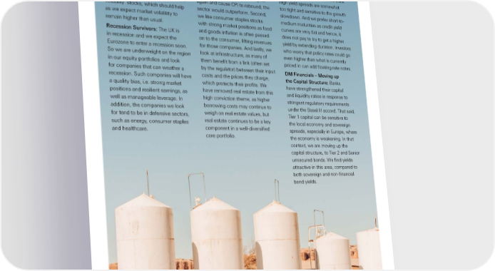 Global Private Banking recovering, in part because banks Hedging Against Inflation: In Short-to-Medium Dated Quality (typically among the high dividend financial markets, no inflation Credit: our large overweight of payers) are getting a lift from rising hedge is perfect, but we find three short-to-medium dated and high- rates. From a style perspective, avenues attractive. Firstly, the energy rated bonds in our core portfolio is dividend stocks tend to be value sector should continue to generate also reflected in our high conviction oriented, which can help balance substantial cash flows, even after themes. We continue to focus on portfolios that are heavy on growth the fall of energy prices. And in investment grade, because we think stocks. They also tend to have a the event that prices were to spike high yield spreads are somewhat quality bias and often qualify as ‘low again and cause CPI to rebound, the too tight and sensitive to the growth volatility’ stocks, which should help sector would outperform. Second, slowdown. And we prefer short-to- as we expect market volatility to we like consumer staples stocks medium maturities as credit yield remain higher than usual. with strong market positions as food curves are very flat and hence, it Recession Survivors: The UK is and goods inflation is often passed does not pay to try to get a higher in recession and we expect the on to the consumer, lifting revenues yield by extending duration. Investors Eurozone to enter a recession soon. for those companies. And lastly, we who worry that policy rates could go So we are underweight on the region look at infrastructure, as many of even higher than what is currently in our equity portfolios and look them benefit from a link (often set priced in can add floating rate notes. for companies that can weather a by the regulator) between their input DM Financials – Moving up recession. Such companies will have costs and the prices they charge, the Capital Structure: Banks a quality bias, i.e. strong market which protects their profits. We have strengthened their capital positions and resilient earnings, as have removed real estate from this and liquidity ratios in response to well as manageable leverage. In high conviction theme, as higher stringent regulatory requirements addition, the companies we look borrowing costs may continue to under the Basel III accord. That said, for tend to be in defensive sectors, weigh on real estate values, but Tier 1 capital can be sensitive to such as energy, consumer staples real estate continues to be a key the local economy and sovereign and healthcare. component in a well-diversified spreads, especially in Europe, where core portfolio. the economy is weakening. In that context, we are moving up the capital structure, to Tier 2 and Senior unsecured bonds. We find yields attractive in this area, compared to both sovereign and non-financial bond yields. 19