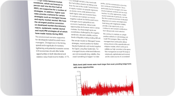 Global Private Banking Investment Outlook Report Hedge Funds We maintain our positive outlook USD strength remains a key trend with profits, and the outsized price action this for hedge funds because market the Fed further ahead in its hiking cycle year continues to be beneficial. This is conditions, which we forecast to than the rest of the world. Tactical shorts particularly true for managers who have persist well into the first half of in equity markets are popular exposures shorter lookback windows and are more 2023, are supportive for a number of as stocks come under pressure from reactive. For other approaches, market strategies. In addition, higher cash both higher rates and recession fears. neutral systematic in particular, we note rates provide a tailwind for certain In contrast we maintain our neutral that the current environment of elevated strategies such as managed futures negative outlook for EM focused macro dispersion at a sector and single stock and equity market neutral. We have managers due to geopolitical and level along with heightened volatility the strongest positive conviction economic headwinds. Idiosyncratic provide a ripe opportunity as we on developed market discretionary opportunities do however exist in certain continue to see outsized contributions macro, systematic market neutral markets. But these bright spots are from idiosyncratic stock selection. and multi-PM strategies all of which nonetheless challenged by the negative We continue to maintain an outright have made money during 2022. sentiment, elevated volatility and low positive outlook on multi-strategy and The environment remains supportive levels of liquidity making trading difficult. multi-PM managers. Many multi-PM for developed market focused macro We remain neutral on Managed Futures managers have continued to deliver managers. Divergences in the timing, strategies, neutral positive for Market strong returns in this unpredictable and speed and magnitude of monetary Neutral Systematic and neutral negative whipsaw market, which continues to tightening and potential recession across for Equity Long-Bias Systematic. For validate our high conviction in the space. G10 economies should offer fertile managed futures while trend followers Risk management at multi-PM shops is opportunities in both directional and are not necessarily long volatility, they notoriously sophisticated and involved, relative-value fixed income trades. In FX, need ‘something to happen’ to make and its varied sources of uncorrelated Daily bond yield moves were much larger than usual, providing hedge funds with many opportunities 0.5 0.4 0.3 0.2 0.1 year Treasury yields (%)0 - -0.1 -0.2 -0.3 Daily moves in 10-0.4 -0.5 2002 2004 2006 2008 2010 2012 2014 2016 2018 2020 2022 Source: Bloomberg, HSBC Global Private Banking as at 22 November 2022. Past performance is not a reliable indicator of future performance. 34