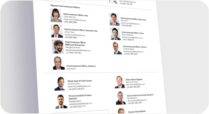 Global Private Banking Investment Outlook Report Global Chief Investment Officer Contributors Willem Sels willem.sels@hsbcpb.com +44 (0)207 860 5258 Director, Global Market Strategist Head of Asset Allocation and Managing Editor Stanko Milojevic Neha Sahni stanko.milojevic@hsbcpb.com neha.sahni@hsbcpb.com +44 (0)207 024 6577 +44 (0)207 024 1341 Regional Chief Investment Officers Chief Investment Officer, Asia Chief Investment Officer, North Asia Cheuk Wan Fan Patrick Ho cheuk.wan.fan@hsbcpb.com patrick.w.w.ho@hsbcpb.com +852 2899 8648 +852 2899 8691 Chief Investment Officer, Southeast Asia Chief Investment Officer, China James Cheo Desmond Kuang james.cheo@hsbcpb.com Desmond.kuang@hsbc.com.cn +65 6658 3885 +86 21 38881020 Chief Investment Officer, EMEA and Switzerland Chief Investment Officer, UK & CI Georgios Leontaris Jonathan Sparks georgios.leontaris@hsbcpb.com jonathan.sparks@hsbcpb.com +41 (0)58 705 5746 +44 (0)20 7860 3248 Chief Investment Officer, Americas Jose Rasco Global Head of Fixed Income Global Head of Equities Laurent Lacroix Kevin Lyne Smith laurent.lacroix@hsbcpb.com kevin.lyne-smith@hsbc.com +44 (0)207 024 0613 +44 (0)207 860 6597 FX & Commodities Product Specialist Senior Fixed Income Credit Specialist Rodolphe Bohn Elena Kolchina rodolphe.bohn@hsbcpb.com elena.kolchina@hsbcpb.com +44 (0)203 359 1177 +44 (0)207 860 3058 Global Market Analyst, Director, Global Equities Real Estate Investment Bryan O’Carroll Guy Sheppard bryan.ocarroll@hsbcpb.com guy.r.sheppard@hsbc.com +44 (0)203 268 4220 +44 (0)207 024 0522 Senior Product Specialist, Private Market Investments Head of European Hedge Fund Research Jorge Huitron Alex Grievson jorge.emilio.huitron@hsbc.com Alex.grievson@hsbc.com +44 (0)203 359 7040 +44 (0)203 359 7065 2
