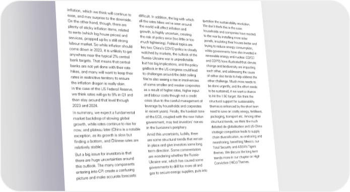 Global Private Banking inflation, which we think will continue to difficult. In addition, the lag with which question the sustainability revolution. ease, and may surprise to the downside. all the rates hikes we’ve seen around We don’t think this is the case: On the other hand, though, there are the world will affect inflation and households and companies have reacted plenty of sticky inflation items, related growth, is highly uncertain, creating to the war by installing more solar to rents (which lag house prices) and the risk of policy error (too little or too panels, insulating their houses better and services, propped up by a still strong much tightening). Political topics are trying to reduce energy consumption, labour market. So while inflation should key too: China’s COVID policy is closely while governments have also invested in come down in 2023, it is unlikely to get watched by markets, the outlook of the renewable energy and nuclear. COP27 anywhere near the typical 2% central Russia-Ukraine war is unpredictable and COP15 have illustrated that climate bank targets. That means that central but has big implications, and the policy change and biodiversity are impacting banks are not yet done with their rate gridlock in the US congress could lead each other, and addressing the cause hikes, and many will want to keep their to challenges around the debt ceiling. of either also tends to help address the rates in restrictive territory to ensure We’re also seeing a rise in insolvencies other challenge. Much more needs to the inflation dragon is really slain. of some smaller and weaker corporates be done urgently, and the effort needs In the case of the US Federal Reserve, as a result of higher rates, higher input to be sustained, if we want a chance we think rates will go to 5% in Q1 and and labour costs though not a credit to hit the 1.5C target. We think the then stay around that level through crisis (due to the careful management of structural support for sustainability 2023 and 2024. leverage by households and corporates themes is enhanced by the short term In summary, we expect a fundamental in recent years). Finally, the hawkish tone need to save on costly energy, fertilisers, market backdrop of slowing global of the ECB, coupled with the new Italian packaging, transport etc. Among other growth, while rates continue to rise for government, may test investors’ nerves structural trends, we think the much now, and plateau later (China is a notable in the Eurozone’s periphery. debated de-globalisation and US-China exception, as its growth is slow but Amid this uncertainty, luckily, there strategic competition leads to supply finding a bottom, and Chinese rates are are some structural trends that remain chain diversification, re-onshoring and relatively stable). in place and give investors some long nearshoring, benefiting Mexico, our But a big issue for investors is that term direction. Some commentators Total Security and ASEAN Tigers there are huge uncertainties around are wondering whether the Russia- themes. We discuss the long term this outlook. The many components Ukraine war, which has caused some trends more in our chapter on High entering into CPI create a confusing governments to drill for more oil and Conviction (HiCo) Themes. picture and make accurate forecasts gas to secure energy supplies, puts into 7