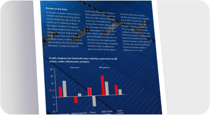 Global Private Banking Europe on the brink hard by the Chinese zero tolerance economic performance, further In Europe, recession seems all but a policy against the COVID pandemic. earnings downgrades seem probable certainty as food and energy prices Because of the cyclical challenges, and we think we will need to wait remain stubbornly high and the war we’re even more defensive in for an easing of the energy crisis continues to create fiscal drag in Europe than in other regions, with before the valuation gap with the the region. Equities in Europe are an overweight in healthcare and US can compress. The UK market also being weighed down by weak an underweight in financials. As in continues to do better than the state domestic demand. Global trade other regions, tight supplies and of the local economy would suggest, flows, which have often helped lift good profitability has allowed us to thanks to the presence of many European equity markets, are set to also keep our overweight position global companies, but the deep cost slow further in the face of this global on the European energy companies. of living crisis and fiscal tightening slowdown. Europe has been hit Valuations look compelling but should nevertheless weigh on given the outlook for the region’s performance in our view. A split congress has historically been relatively constructive for US stocks, under a Democratic president. 20 Democrat Repulican 15 10 % 5 0 -5 -10 Supportive Mildly Supportive Mixed Mildly Hostile Hostile Congress Congress Congress Congress Congress Source: HSBC Global Asset Management, HSBC Global Private Banking as at 22 November 2022. Past performance is not a reliable indicator of future performance. 25