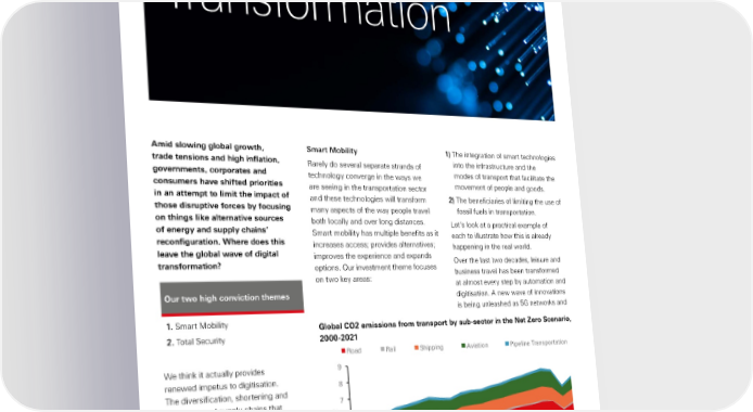 Global Private Banking Investment Outlook Report Digital Transformation Amid slowing global growth, Smart Mobility 1) The integration of smart technologies trade tensions and high inflation, Rarely do several separate strands of into the infrastructure and the governments, corporates and technology converge in the ways we modes of transport that facilitate the consumers have shifted priorities are seeing in the transportation sector movement of people and goods. in an attempt to limit the impact of and these technologies will transform 2) The beneficiaries of limiting the use of those disruptive forces by focusing many aspects of the way people travel fossil fuels in transportation. on things like alternative sources both locally and over long distances. Let’s look at a practical example of of energy and supply chains’ Smart mobility has multiple benefits as it each to illustrate how this is already reconfiguration. Where does this increases access; provides alternatives; happening in the real world. leave the global wave of digital improves the experience and expands transformation? options. Our investment theme focuses Over the last two decades, leisure and on two key areas: business travel has been transformed at almost every step by automation and Our two high conviction themes digitisation. A new wave of innovations is being unleashed as 5G networks and 1. Smart Mobility Global CO2 emissions from transport by sub-sector in the Net Zero Scenario, 2. Total Security 2000-2021 Road Rail Shipping Aviation ipeline anspotation We think it actually provides 9 renewed impetus to digitisation. 8 The diversification, shortening and automation of supply chains that 7 companies are seeking often involves 6 much more digitisation. And the 5 efficiency drives to tackle inflation often lead to manually intensive processes 4 being substituted for digital alternatives. 3 Digital technologies are transforming Gigatonnes of CO2 society both by substituting existing 2 technologies or processes or devices, 1 and also by opening up new avenues of 0 doing things. 2000 2003 2006 2009 2012 2015 2018 2021 Source: International Energy Agency, HSBC Global Private Banking as at 22 November 2022 20