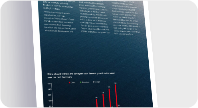 Global Private Banking Investment Outlook Report relative to history and other regional innovation of new energy vehicles benefit from the net zero transition. markets. Over the past decade, technologies in the region. We We expect China’s annual solar ASEAN economies have undergone favour renewable energy equipment installed capacity to reach 115GW a healthy reset as they have makers of solar, wind and green by 2023 and increase at a 15% deleveraged and continued to invest hydrogen, smart grid manufacturers CAGR to 150GW in 2025. in infrastructure. As a result, ASEAN and leaders in the Electric Vehicles In India, investments of around companies have developed resilient (EV) supply chains. The World USD300bn will be needed to fundamental strengths and stronger Bank estimates China needs to complete the 500GW of renewable balance sheets to withstand invest up to USD17trn for energy energy capacity target by 2030. headwinds from the strong dollar transition, green infrastructure and Southeast Asian countries are also and high US rates. technologies to meet its carbon rushing to issue green bonds to Among the structural growth neutrality goals by 2060. China is finance eco-friendly projects. In opportunities, our High growing into a global powerhouse ASEAN and East Asia, the amount Conviction Theme of Asia’s Green in EV, and one out of three new of sustainable bonds outstanding Transformation stays focused on cars sold in China is now electric. accounted for about 18% of world’s opportunities from the energy Pure EV plays, some conventional total, trailing only Europe as the transition and independence, green Original Equipment Manufacturers second-largest market, according to infrastructure development and (OEMs) and battery companies can Asian Development Bank. China should witness the strongest solar demand growth in the world over the next few years. 160 China Americas Europe 150 140 135 120 115 100 98 80 44 54 60 53 55 37 41 53 44 48 46 49 40 39 42 35 30 28 21 26 20 17 13 17 19 20 7 8 10 0- 2016 2017 2018 2019 2020 2021 2022e 2023e 2024e 2025e Source: SolarPower Europe, BNEF, HSBC estimates, HSBC Global Research, HSBC Global Private Banking, 22 November 2022. 16