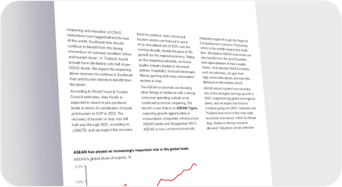 Global Private Banking reopening and relaxation of COVID trend to continue. Asia’s travel and integrated region through the Regional restrictions have lagged behind the rest tourism sectors are forecast to grow Comprehensive Economic Partnership, of the world. Southeast Asia should at an annualised rate of 8.5% over the which is the world’s largest free trade continue to benefit from the strong coming decade, double the pace of 4% bloc. We believe ASEAN economies can momentum of overseas travellers’ inflow growth for the regional economy. Riding also benefit from the reconfiguration and tourism boom. In Thailand, tourist on the reopening tailwinds, we favour and regionalisation of Asia’s supply arrivals have climbed to only half of pre- quality industry leaders in the travel, chains. And selected ASEAN markets, COVID levels. We expect the reopening- airlines, hospitality, food and beverages, such as Indonesia, can gain from driven recovery to continue in Southeast Macau gaming and mass consumption high commodity prices, proving to be Asia and tourism stands to benefit from sectors in Asia. defensive to the inflation shock. the boom. The ASEAN economies are showing ASEAN stock markets have recorded According to World Travel & Tourism silver linings of resilience with a strong one of the strongest earnings growth in Council estimates, Asia Pacific is consumer spending outlook amid 2022, outperforming global and regional expected to revert to pre-pandemic continued economic reopening. We peers, and we expect this trend to levels in terms of contribution of travel launch a new theme on ASEAN Tigers, continue going into 2023. Indonesia and and tourism to GDP in 2023. The capturing growth opportunities in Thailand have some of the most solid recovery of tourism in Asia was still consumption companies, infrastructure, economic momentum within Southeast half way through 2021, according to ASEAN banks and Singaporean REITs. Asia, thanks to strong consumer UNWTO, and we expect this recovery ASEAN is now a more economically demand. Valuations remain attractive ASEAN has played an increasingly important role in the global trade ASEAN’s global share of exports, % 8.0% 7.0% 6.0% 5.0% 4.0% 3.0% 1990 1995 2000 2005 2010 2015 2020 Source: UNCTAD Stat, HSBC Global Private Banking, 22 November 2022. 15