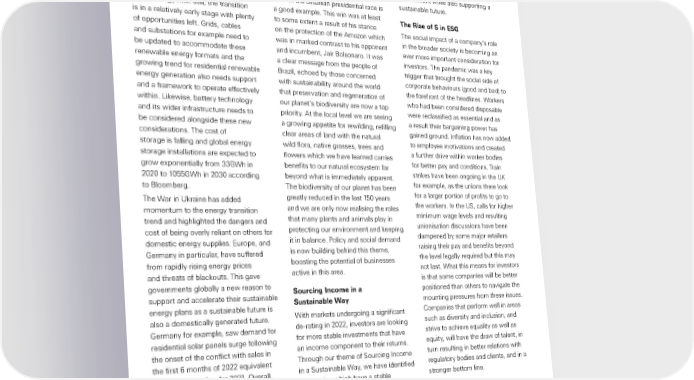 Global Private Banking Energy Transition and Independence Financing Biodiversity Action can deliver attractive dividends but also The energy transition from high carbon Biodiversity is rapidly moving up the do so in a sustainable way. This way fossil fuels to a lower carbon mix of agenda and seeing many initiatives to try investors can get the benefits of fossil fuels and renewables has been and reverse some of the damage that we an attractive investment approach well underway for many years with have caused to our natural environment. aligned to the current investment solar, wind and other renewable sources The recent win by Luiz Inácio Lula da environment while also supporting a such as hydro gaining a bigger share Silva in the Brazilian presidential race is sustainable future. of the energy mix. Still, the transition a good example. This win was at least The Rise of S in ESG is in a relatively early stage with plenty to some extent a result of his stance of opportunities left. Grids, cables on the protection of the Amazon which The social impact of a company’s role and substations for example need to was in marked contrast to his opponent in the broader society is becoming an be updated to accommodate these and incumbent, Jair Bolsonaro. It was ever more important consideration for renewable energy formats and the a clear message from the people of investors. The pandemic was a key growing trend for residential renewable Brazil, echoed by those concerned trigger that brought the social side of energy generation also needs support with sustainability around the world corporate behaviours (good and bad) to and a framework to operate effectively that preservation and regeneration of the forefront of the headlines. Workers within. Likewise, battery technology our planet’s biodiversity are now a top who had been considered disposable and its wider infrastructure needs to priority. At the local level we are seeing were reclassified as essential and as be considered alongside these new a growing appetite for rewilding, refilling a result their bargaining power has considerations. The cost of clear areas of land with the natural gained ground. Inflation has now added storage is falling and global energy wild flora, native grasses, trees and to employee motivations and created storage installations are expected to flowers which we have learned carries a further drive within worker bodies grow exponentially from 33GWh in benefits to our natural ecosystem far for better pay and conditions. Train 2020 to 1055GWh in 2030 according beyond what is immediately apparent. strikes have been ongoing in the UK to Bloomberg. The biodiversity of our planet has been for example, as the unions there look The War in Ukraine has added greatly reduced in the last 150 years for a larger portion of profits to go to momentum to the energy transition and we are only now realising the roles the workers. In the US, calls for higher trend and highlighted the dangers and that many plants and animals play in minimum wage levels and resulting cost of being overly reliant on others for protecting our environment and keeping unionisation discussions have been domestic energy supplies. Europe, and it in balance. Policy and social demand dampened by some major retailers Germany in particular, have suffered is now building behind this theme, raising their pay and benefits beyond from rapidly rising energy prices boosting the potential of businesses the level legally required but this may and threats of blackouts. This gave active in this area. not last. What this means for investors governments globally a new reason to is that some companies will be better support and accelerate their sustainable Sourcing Income in a positioned than others to navigate the energy plans as a sustainable future is Sustainable Way mounting pressures from these issues. also a domestically generated future. With markets undergoing a significant Companies that perform well in areas Germany for example, saw demand for de-rating in 2022, investors are looking such as diversity and inclusion, and residential solar panels surge following for more stable investments that have strive to achieve equality as well as the onset of the conflict with sales in an income component to their returns. equity, will have the draw of talent, in the first 6 months of 2022 equivalent Through our theme of Sourcing Income turn resulting in better relations with to the total number for 2021. Overall, in a Sustainable Way, we have identified regulatory bodies and clients, and in a the trend of renewable energy expansion companies which have a stable stronger bottom line. is ongoing. foundation at the business level and 23