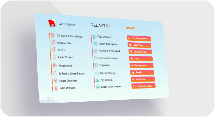GVD / Folders IMPACT Fully-Branded Professionalism Off-Brand & Compliance Search & Navigation Save Time Endless Files Boring Interactive & Animated Understanding Lacks Context Context & Evidence Trust Organized Transparency Fragmented Reach Secure Sharing Difficult to Share/Secure Lack of Insight Code-free Paper-Optimized Any Devices Lack of Insight Engagement Insights Feedback & ROI