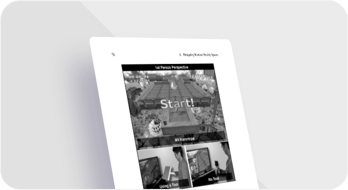 78 6 DesigningBlended Reality Spaces Fig. 6.1 Experimental conditions: 1st person perspective These results confirm the importance of incorporating tangible tools in blended reality spaces aimed at eliciting a high sense of presence, and also suggest that tangibility has no effect on self-presence. Although a first person perspective is of course more natural than a third person perspective on one’s own actions, it did not increase presence, which is a surprising and important finding for the future of blended reality spaces. In fact this suggestion is consistent with some findings (Ehrsson 2007; Lenggenhager et al. 2007) from experimentation on ‘out-of-body’ experiences (essentially, third person viewpoint experiences of self) supporting the possibility of some kind of ‘distributed embodiment’ (Waterworth and Waterworth 2014)in blendedreality space. Using a racket is, of course, the natural way to play tennis. In the blended game situation, the physical racket seems to work to bridge the gap between the physical world and virtual world, and increased the feeling of presence. It could be argued that if a game environment does not require such a physical tool, the effects of tangibility on presence may be lacking.While this was not tested in our experiment, we would emphasis that tangibility is not the same as tool-ness. Even in a game