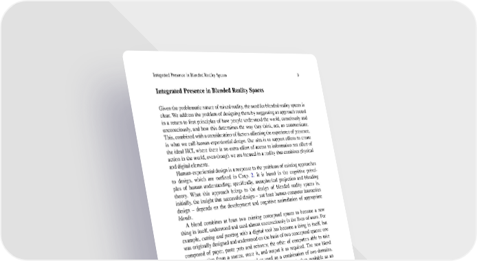 Integrated Presence in Blended Reality Spaces 9 Integrated Presence in Blended Reality Spaces Giventheproblematicnatureofmixedreality,theneed forblendedreality spacesis clear. We address the problem of designing them by suggesting an approach rooted in a return to first principles of how people understand the world, consciously and unconsciously, and how this determines the way they think, act, an communicate. This, combinedwithaconsiderationof factorsaffectingtheexperienceofpresence, is what we call human-experiential design. Our aim is to support efforts to create the ideal HCI, where there is no extra effort of access to information not effort of action in the world, even though we are located in a reality that combines physical anddigital elements. Human-experientialdesign is a response to the problems of existing approaches to design, which are outlined in Chap. 2. It is based in the cognitive princi- ples of human understanding; specifically, metaphorical projection and blending theory. What this approach brings to the design of blended reality spaces is, initially, the insight that successful design – not least human-computer interaction design – depends on the development and cognitive assimilation of appropriate blends. A blend combines at least two existing conceptual spaces to become a new thing in itself, understood and used almost unconsciously in the lives of users. For example, cutting and pasting with a digital tool has become a thing in itself, but was originally designed and understood on the basis of two conceptual spaces: one composed of paper, paste pots and scissors; the other of computers able to take in information from a source, store it, and output it as required. The new blend is no longer thought of, experienced or used as a combination of two domains, but as a single entity – cutting and pasting. This entity is then available as an input space to further blended, in which cutting and pasting can be combined with anotherconceptualspace,suchascomposingmusic.Chapter3describesthisdesign approachindetail,withaparticularfocusontheimportanceofmetaphorandblends in HCI design. Human-experiential design is also a response to the needs of people for a way of balancing their physical and communicational needs in a new, emerging world. Theseproblemsofdesignincludeamismatchbetweentheconcernsoftechnologies versus the concerns of people. Human-experientialdesign provides a way to bridge contextualgapsinunderstanding,forexamplebetweenyoungandold,betweenhere andthere,andbetweenthetechnologicallysavvyandtherelativelynaïve.Itisaway designing blends of the physical and virtual in which contextual gaps are bridged andwecanfeelaunitarysenseofbeingpresent. Chapters 4 and 5 describe how human-experiential design takes the existing blending approach to HCI design a step further by applying it to the design of combinations of physical and digital realities, making it possible to bridge contextualrealitygapsbetweendistantparticipantsinaninteraction.Inthisprocess, what were previously understood and used as mixed realities become transformed into blended reality spaces. For example, sending text messages on a mobile phone