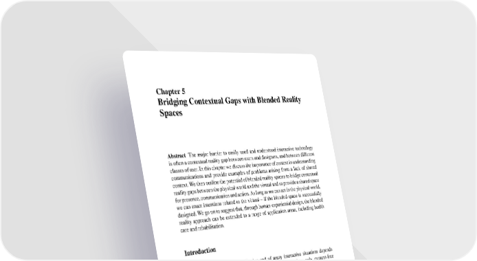 Chapter5 Bridging Contextual Gaps with Blended Reality Spaces Abstract The major barrier to easily used and understood interactive technology is often a contextual reality gap between users and designers, and between different classesofuser.Inthischapterwediscusstheimportanceofcontextinunderstanding communications and provide examples of problems arising from a lack of shared context. We then outline the potential of blended reality spaces to bridge contextual realitygapsbetweenthephysicalworldandthevirtualandsoprovideasharedspace forpresence,communicationandaction.Aslongaswecanactinthephysicalworld, wecanenact intentions related to the virtual – if the blended space is successfully designed.Wegoontosuggestthat,throughhuman-experientialdesign,theblended reality approach can be extended to a range of application areas, including health care and rehabilitation. Introduction Making sense of any communication and of many interactive situations depends on sharing a context, except in those rare situations when only context-free explicit statements are exchanged – as at times in a court of law. In all other situations, and throughout our lives, we use context unconsciously to make sense of what is happening and what others are saying. The major barrier to easily used and understood interactive technology is often a contextual reality gap between users and designers, and between different classes of user. Increasingly often, the introductionofembeddedandworntechnologyintothephysicalenvironmentopens up contextual reality gaps when users try to function in both. Blended reality spaces are designed to bridge this gap and provide a shared space for presence, communicationandaction. As in all blend-based design (see Chap. 4), in designing blended reality spaces we combine aspects of one input space with those of another – to arrive at a new integrated reality that has the potential to eventually stand as a thing-in-itself in our understanding.Whendesigningblendedrealityspaces,oneoftheinputspacesisthe physicalworld,andtheproductofourdesignprocessisarealitythatblendsaspects ©Springer International Publishing Switzerland 2016 61 J. Waterworth, K. Hoshi, Human-Experiential Design of Presence in Everyday Blended Reality, Human–Computer Interaction Series, DOI10.1007/978-3-319-30334-5_5