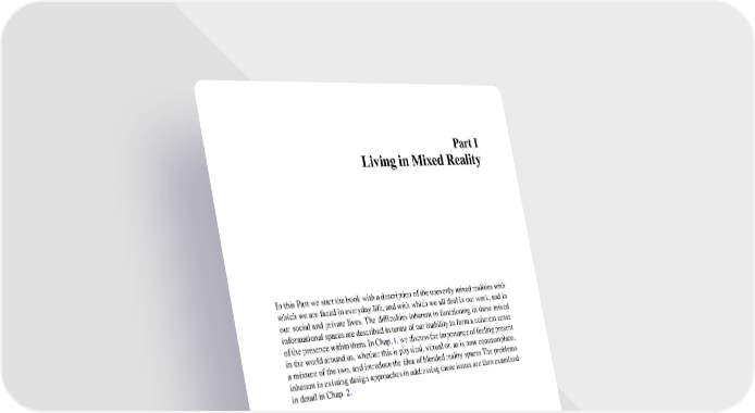 Part I Living in Mixed Reality In this Part we start the book with a description of the unevenly mixed realities with whichwearefacedineverydaylife, andwith whichweall dealin ourwork,andin our social and private lives. The difficulties inherent in functioning in these mixed informationalspaces are describedin terms of our inability to form a coherent sense ofthepresencewithinthem.InChap.1,wediscusstheimportanceoffeelingpresent in the world around us, whether this is physical, virtual or, as is now commonplace, a mixture of the two, and introduce the idea of blended reality spaces The problems inherent in existing design approaches in addressing these issues are then examined in detail in Chap. 2.