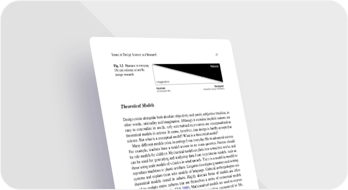 Issues in Design Science and Research 41 Fig. 3.2 Humans ineveryday life and rational scientific design research Theoretical Models Design exists alongside both absolute objectivity and purely subjective intuition, in other words, rationality and imagination. Although it contains implicit notions not easy to externalize in words, only externalized expressions are conceptualized as theoretical models in science. It seems, therefore, that design is hardly accepted as science. But what is a conceptual model? What is a theoretical model? Manydifferentmodels exist, in settings from everyday life to advanced science. For example, teachers have a model answer to an exam question. Parents should be role models for children. Mechanical models explain how a machine works, and can be used for generating and analysing data from experiments models, such as those using scale models of vehicles in wind tunnels. There is a model (a mould) to reproducemachinesorplasticartefacts. Linguists investigategrammarsand writing systems and explain them with models of language. Cultural anthropologists use theoretical models rooted in culture. Highly abstract forms of models are often used to explain entire cultures that are themselves a series of contextual models for behaviour and thought (Hall 1969). Mathematical models are used to express scientifically reliable qualities, quantities, and relationships encountered in life, predominantlyby natural scientists. We can find different types of models used to explain cognitive systems, in science, philosophical systems and even in myths (Hall 1969). Scientists study only those things that can be externalized as models. They use models in order to experiment with how things work, and try to foresee how things would function in the future. They judge the effectiveness of a model by exploring how consistent it is, not as an everyday life concern but as a mechanical or philosophical system. In the design domain (called ‘scientific design’), theoretical models are usually composed of theory, method and tool. Theory is a generalized and abstract form of explanation, which helps to understand the salient issues that we try to design for or around. It helps also to describe particular phenomena, but describing is not the same as designing. As pointed out earlier in the example of designing a chair, we can describe what a chair is in a generalized way, but it is not easy to design a satisfactory chair. Method in many forms of physical and digital design is a tool of understandingactions relevant to a domain of problem. The generalization of theory, the development and testing of method, and the creation of a tool are explicit activities based on critical analysis and experimenting until a solution is found(Poggenpohl2009).