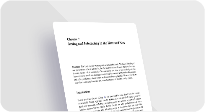 Chapter7 Acting and Interacting in the Here and Now Abstract Thefinalchaptersumsupandconcludesthebook.Thefutureblendingof ourperceptionsof,andactionsin,thephysicalworldandthroughdigitaltechnology is not a luxury – it is a necessity. We summarise our view of how to design for the humanbeingsweallare,tosupportactionandinteractioninblendedrealityspaces, and offer predictions about future applications in everyday life. We also provide an overviewof the key features, and some limitations of blended reality spaces. Introduction In the previous chapter (Chap. 6), we presented in some detail how the human- experiential design approach can be applied to create blended reality spaces for particular purposes, including interactive games and a home support and commu- nication system for the elderly. In this chapter we offer predictions about future applications in everyday life, allowing people to live in the here and now while feelingpresentandactinginaseamlesslyblendedcombinationofthephysicalworld anddigital information and communicationchannels. We also providean overview of the key features, advantages and some limitations of our approach to designing blendedreality spaces. In recent years digital technology has addressed and changed several different aspects of our daily life and work. These aspects include our mental activities, such as how we remember things and find our way in new environments. For example, weneednolongercarryout mental arithmetic, memorise phone numbers, or study maps in advance to find our way in a city we are visiting for the first time. These things are dealt with by technology and so we no longer need do this work. Our bodies, too, benefit from the new technologies that tell us how many calories we are using, how many steps we have taken today, whether we are exercising too little or too much. Our social lives have also been transformed by the use of mobile phones,text messagingand social media, with very few individuals choosing not to beconnectedwithpeopletheyknow(andmanytheydon’treallyknow)inthisway. Weincreasingly live in a world of mixed realities. Through the proliferation of personal mobile devices and possibilities for ubiquitous computing, we almost con- stantly interact with digital content and communicationsoften while also navigating ©Springer International Publishing Switzerland 2016 93 J. Waterworth, K. Hoshi, Human-Experiential Design of Presence in Everyday Blended Reality, Human–Computer Interaction Series, DOI10.1007/978-3-319-30334-5_7