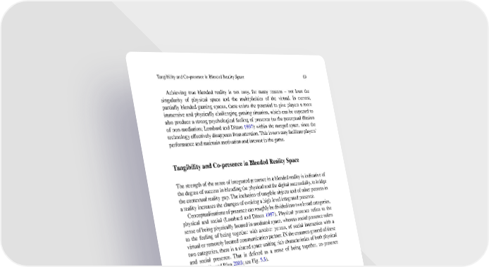 Tangibility and Co-presence in Blended Reality Space 69 Achieving true blended reality is not easy, for many reasons – not least the singularity of physical space and the multiplicities of the virtual. In current, partially blended gaming spaces, there exists the potential to give players a more immersive and physically challenging gaming situation, which can be expected to also produce a strong psychological feeling of presence (as the perceptual illusion of non-mediation; Lombard and Ditton 1997) within the merged space, since the technologyeffectivelydisappearsfromattention.Thisinturnmayfacilitateplayers’ performanceand maintain motivation and interest in the game. Tangibility and Co-presence in Blended Reality Space Thestrength of the sense of integrated presence in a blended reality is indicative of the degree of success in blending the physical and the digital successfully, to bridge the contextual reality gap. The inclusion of tangible objects and of other persons in a reality increases the changes of evoking a high level integrated presence. Conceptualizationsofpresencecanroughlybedividedintotwobroadcategories, physical and social (Lombard and Ditton 1997). Physical presence refers to the sense of being physically located in mediated space, whereas social presence refers to the feeling of being together with another person, of social interaction with a virtual or remotely located communicationpartner. IN the common groundof these two categories, there is a shared space uniting rich characteristics of both physical and social presence. That is defined as a sense of being together, co-presence (Ijsselsteijn and Riva 2003;seeFig.5.5). Fig. 5.5 Different types of presence