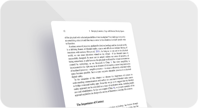 62 5 BridgingContextual Gaps withBlended Reality Spaces of the physical with selected possibilities from the digital. The challenge is to arrive at something coherent and that makes sense in the situations in which people wish to function. Aunitarysenseofpresence,mediatedbybothtechnologyandthephysicalworld, is a defining feature of blended reality spaces and affords an intimate linking of intentions with actions (Riva et al. 2011). As long as we can act in the physical world, we can enact intentions related to the virtual – if the blended space is successfully designed. In most current mixed realities our sense of presence, of being somewhere, is split between the physical world and the virtual environments created by technology, as we discussed in Chap. 1. But when tangibility is incorporated in the right way as an element of interaction, a more integrated sense of mediated presence – tangible presence – in what is effectively a blended reality space becomes possible. Such a space supports shareable presence in a physical- digital reality. In the remainder of this chapter we discuss the importance of context in understanding communications and outline the potential of blended reality spaces to bridge contextual reality gaps. From this we go on to suggest that the blended reality approach can be extended to a range of application areas, including health care and rehabilitation. In the next chapter (Chap. 6), we present examples of the approachapplied to the design of a variety of illustrative everyday life contexts. TheImportanceofContext Contemporary information and communication technology has broken through many boundaries between cultures, societies and even political systems, but has not yet overcome the communicational boundaries that arise from a lack of shared understanding, a contextual reality gap. Understanding how people really are is difficult in cross-cultural communication. We unfortunately tend to blame ‘people of different cultures’, for their apparent “stupidity, deceit, or craziness” (Hall 1969, ix), when it is actually obvious that we often just don’t understand people from different contexts than our own. How can interactive systems effectively help with bridging the reality gap generated between different users’ perceptions in different contexts? In order to explorewherethesharingofrealityisrestrictedorconcealed,weneedtoinvestigate more closely everyday life communication that creatively and effectively enables mutual understandings between people. Everyday communication contains hidden resources for creating harmonious accord of people and things that can be applied in interaction design. Communication is commonly assumed to involve a meaningful linguistic exchange. However, when we look carefully at everyday communication between families, close friends and loved ones, they communicate rather like a synchronized instrument, each anticipating the wishes of the other, making communication without or with little explicit information. Imagine, for example, when a child comes home from her/his school, sits on a sofa, has a soft drink with gulping,