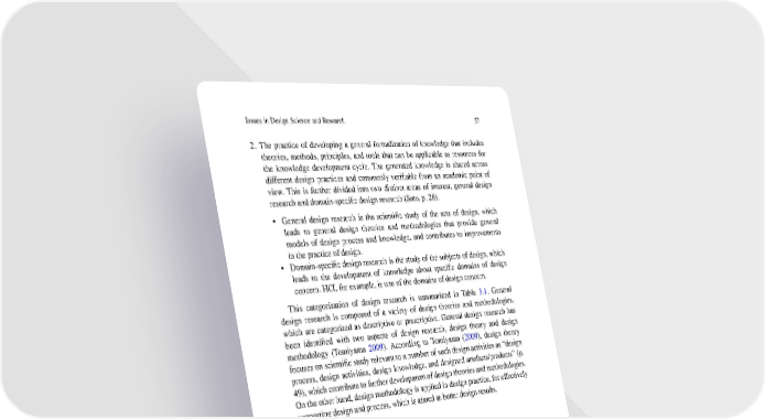 Issues in Design Science and Research 37 2. The practice of developing a general formalization of knowledge that includes theories, methods, principles, and tools that can be applicable as resources for the knowledge development cycle. The generated knowledge is shared across different design practices and commonly verifiable from an academic point of view. This is further divided into two distinct areas of interest, general design research and domain-specificdesign research (Sato, p. 28). • General design research is the scientific study of the acts of design, which leads to general design theories and methodologies that provide general models of design process and knowledge, and contributes to improvements in the practice of design. • Domain-specific design research is the study of the subjects of design, which leads to the development of knowledge about specific domains of design concern.HCI, for example, is one of the domains of design concern. This categorization of design research is summarized in Table 3.1. General design research is composed of a variety of design theories and methodologies, which are categorized as descriptive or prescriptive. General design research has been identified with two aspects of design research, design theory and design methodology (Tomiyama 2009). According to Tomiyama (2009), design theory focuses on scientific study relevant to a number of such design activities as “design process, design activities, design knowledge, and designed artefacts/products” (p. 49), which contribute to further developmentof design theories and methodologies. Ontheotherhand,designmethodologyis appliedindesignpractice,foreffectively supporting design and process, which is aimed at better design results. Table 3.1 Categorization of design research Aspect of Design research Research type research Knowledge Domains (1) The practice of (e.g.) Information (e.g.) developing information User research development Statistical data for a particular design Marketresearch Contextual project information Experimental data (2) The practice of (2a) General General the- (e.g.) (e.g.) developing a designresearch ory/method Descriptive Human-computer conceptualized body of development models interaction knowledge Prescriptive Information models systems (2b) Domain- Design the- Design Design specific design ory/method methods, (sustainable research development frameworks healthcare, etc.) and principles