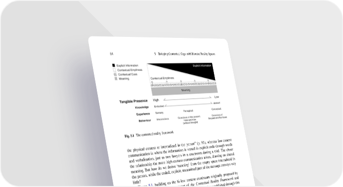 64 5 BridgingContextual Gaps withBlended Reality Spaces Fig. 5.1 The contextual reality framework the physical context or internalized in the person” (p. 91), whereas low-context communication is where the information is vested in explicit code through words and verbalization, just as two lawyers in a courtroom during a trial. The closer the relationship the more high-context communication arises, drawing on shared meaning. But how do we derive ‘meaning’ from the empty space internalized in the person, while the coded, explicit, transmitted part of the message conveys very little? Figure 5.1, building on the hi-low context continuum originally proposed by Hall (1976), represents our concept of the Contextual Reality Framework and shows how emptiness and meaning have a strong relation established through this communicativeprocess. Context refers to the conditions in which a communication exists that make its meaning understandable. Meaning, hence, can be clarified by such contextual cuesasthesurroundings,circumstances,environment,background,orsetting.More specifically, subtle cues such as weight, texture, smell, airflow, sound, light and so on contribute to context. A contextual cue is a catalyst that facilitates creativity throughsensoryexperience.AccordingtoKrippendorff(2005),“Senseisthefeeling of being in contact with the world without reflection, interpretation, or explanation” (p. 50). Naturally synchronizedcommunicationin everydaylife largelyreliesonthe unconscious affirmation of the sense of being filled up and/or filling up emptiness with contextual cues. Perceptual experience is a group of sensations automatically retained and integrated by percepts, which gives it the ability to capture the current state of being in a world. It takes place externally, in the present, the here and now, neither in the past nor in the future (Riva et al. 2004). Our bodily involvement with perceived objects and our perception of objects are inseparable. We become harmonized to things that all of us end up doing without really thinking. It is meaningless to think of mind, body, and context separately.