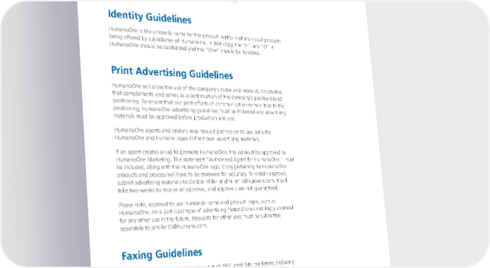 Advertising HumanaOne encourages agents and brokers to advertise to increase agency name recognition and sales of HumanaOne products. HumanaOne offers professional, quality advertising materials, free of charge, which can be customized to include an agent’s name, address, phone number or email address. Contact your sales representative for additional information on this opportunity. Identity Guidelines HumanaOne is the umbrella name for the product portfolio of individual products being offered by subsidiaries of Humana Inc. In text copy, the “H” and “O” in HumanaOne should be capitalized and the “One” should be italicized. Print Advertising Guidelines HumanaOne will allow the use of the company’s name and products on creative that complements and serves as a continuation of the company’s positive brand positioning. To ensure that our joint efforts of communication remain true to the positioning, HumanaOne advertising guidelines must be followed and advertising materials must be approved before production and use. HumanaOne agents and brokers may request permission to use both the HumanaOne and Humana logos in their own advertising materials. If an agent creates an ad to promote HumanaOne, the ad must be approved by HumanaOne Marketing. The statement “Authorized Agent for HumanaOne.” must be included, along with the HumanaOne logo. Copy pertaining to HumanaOne products and process will have to be reviewed for accuracy. To obtain approval, submit advertising materials to Debbie Miller at dmiller15@humana.com. It will take two weeks to receive an approval, and approvals are not guaranteed. Please note, approval to use Humana’s name and product logos, such as HumanaOne, on a particular type of advertising material does not imply approval for any other use in the future. Requests for other uses must be submitted separately to dmiller15@humana.com. Faxing Guidelines The Telephone Consumer Protection Act of 1991 prohibits marketers, including agents, from sending faxes to individuals with whom they have no existing business relationship. In the event of a violation of the TCPA, individuals are entitled to collect damages directly from the marketer for $500 to $1,500 or recover actual monetary loss, whichever is higher. Agents in violation of the TCPA may have their Humana agent contract terminated. 5