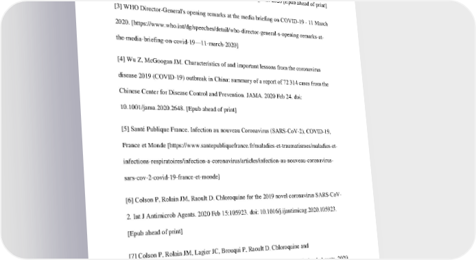 15 the challenges. Int J Antimicrob Agents. 2020 Feb 17:105924. doi: 10.1016/j.ijantimicag.2020.105924. [Epub ahead of print] [2] Wang LS, Wang YR, Ye DW, Liu QQ. A review of the 2019 Novel Coronavirus (COVID-19) based on current evidence”. Int J Antimicrob Agents. 2020 [Epub ahead of print] [3] WHO Director-General's opening remarks at the media briefing on COVID-19 - 11 March 2020. [https://www.who.int/dg/speeches/detail/who-director-general-s-opening-remarks-at- the-media-briefing-on-covid-19---11-march-2020] [4] Wu Z, McGoogan JM. Characteristics of and important lessons from the coronavirus disease 2019 (COVID-19) outbreak in China: summary of a report of 72 314 cases from the Chinese Center for Disease Control and Prevention. JAMA. 2020 Feb 24. doi: 10.1001/jama.2020.2648. [Epub ahead of print] [5] Santé Publique France. Infection au nouveau Coronavirus (SARS-CoV-2), COVID-19, France et Monde [https://www.santepubliquefrance.fr/maladies-et-traumatismes/maladies-et- infections-respiratoires/infection-a-coronavirus/articles/infection-au-nouveau-coronavirus- sars-cov-2-covid-19-france-et-monde] [6] Colson P, Rolain JM, Raoult D. Chloroquine for the 2019 novel coronavirus SARS-CoV- 2. Int J Antimicrob Agents. 2020 Feb 15:105923. doi: 10.1016/j.ijantimicag.2020.105923. [Epub ahead of print] [7] Colson P, Rolain JM, Lagier JC, Brouqui P, Raoult D. Chloroquine and hydroxychloroquine as available weapons to fight COVID-19. Int J Antimicrob Agents. 2020 [Epub ahead of print]