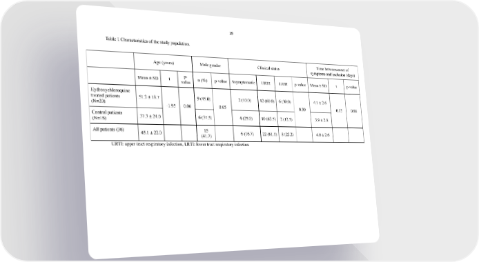 19 Table 1 Characteristics of the study population. Age (years) Male gender Clinical status Time between onset of symptoms and inclusion (days) Mean ± SD t p- n (%) p-value Asymptomatic URTI LRTI p-value Mean ± SD t p-value value Hydroxychloroquine treated patients 51.2 ± 18.7 9 (45.0) 2 (10.0) 12 (60.0) 6 (30.0) 4.1 ± 2.6 (N=20) -1.95 0.06 0.65 0.30 -0.15 0.88 Control patients 37.3 ± 24.0 6 (37.5) 4 (25.0) 10 (62.5) 2 (12.5) 3.9 ± 2.8 (N=16) All patients (36) 45.1 ± 22.0 15 6 (16.7) 22 (61.1) 8 (22.2) 4.0 ± 2.6 (41.7) URTI: upper tract respiratory infection, LRTI: lower tract respiratory infection