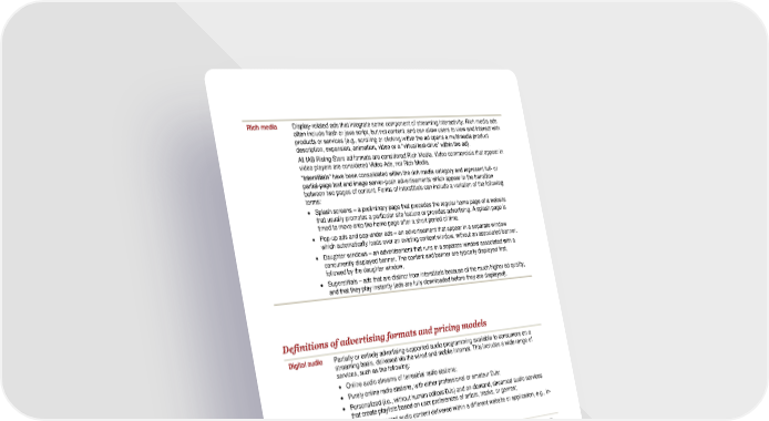 Rich media Display-related ads that integrate some component of streaming interactivity. Rich media ads often include flash or java script, but not content, and can allow users to view and interact with products or services (e.g., scrolling or clicking within the ad opens a multimedia product description, expansion, animation, video or a “virtual test-drive” within the ad). All IAB Rising Stars ad formats are considered Rich Media. Video commercials that appear in video players are considered Video Ads, not Rich Media. “Interstitials” have been consolidated within the rich media category and represent full- or partial-page text and image server-push advertisements which appear in the transition between two pages of content. Forms of interstitials can include a variation of the following terms: Splash screens – a preliminary page that precedes the regular home page of a website that usually promotes a particular site feature or provides advertising. A splash page is timed to move onto the home page after a short period of time. Pop-up ads and pop-under ads – an advertisement that appear in a separate window which automatically loads over an existing content window, without an associated banner. Daughter windows – an advertisement that runs in a separate window associated with a concurrently displayed banner. The content and banner are typically displayed first, followed by the daughter window. Superstitials – ads that are distinct from interstitials because of the much higher ad quality, and that they play instantly (ads are fully downloaded before they are displayed). Definitions of advertising formats and pricing models Digital audio Partially or entirely advertising-supported audio programming available to consumers on a streaming basis, delivered via the wired and mobile internet. This includes a wide range of services, such as the following: Online audio streams of terrestrial radio stations; Purely online radio stations, with either professional or amateur DJs; Personalized (i.e., without human editors/DJs) and on-demand, streamed audio services that create playlists based on user preferences of artists, tracks, or genres; Music or spoken word audio content delivered within a different website or application, e.g., in- game music services. Digital Audio is currently included in Other. Digital video Advertising that appears before, during or after digital video content in a video player (i.e. pre- advertising roll, mid-roll, post-roll video ads). Digital Video Ads include TV commercials online and can appear in streaming content or in downloadable video. Display-related ads on a page (that are not in a player) that contain video are categorized as rich media ads. Video Overlays are also categorized as Digital Video Advertising. Video overlays include small ads that appear on top of digital video content. They can appear to be display, video, rich media, text or another ad format but are contained within the video player. 23