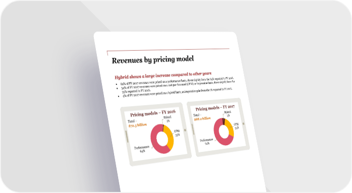 Revenues by pricing model Hybrid shows a large increase compared to other years 62% of FY 2017 revenues were priced on a performance basis, down slightly from the 64% reported in FY 2016. 34% of FY 2017 revenues were priced on a cost per thousand (CPM) or impression basis, down slightly from the 35% reported in FY 2016. 4% of FY 2017 revenues were priced on a hybrid basis, an impressive gain from the 1% reported in FY 2016. PwC | IAB internet advertising revenue report 17