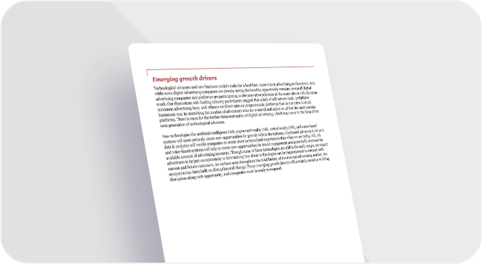 Emerging growth drivers Technological advances and new business models make for a healthier, more robust advertising environment. And, while some digital advertising companies are already seeing the benefits, opportunity remains, as not all digital advertising companies and platforms are participating in the innovative solutions at the same rate or with the same reach. Our discussions with leading industry participants suggest that a lack of self-service tools, prohibitive minimum advertising buys, and reliance on direct sales or programmatic platforms that do not cater to small businesses may be restricting the number of advertisers who are aware of and active on all but the most popular platforms. There is room for the further democratization of digital advertising, which may come in the form of the next generation of technological advances. New technologies like artificial intelligence (AI), augmented reality (AR), virtual reality (VR), and voice-based systems will most certainly create new opportunities for growth within the industry. Continued advances in AI and data & analytics will enable companies to create more personalized experiences than what we see today. VR, AR and voice-based systems will help to create new opportunities for brand engagement and potentially increase the available amount of advertising inventory. Though many of these technologies are still in the early stages, we expect advertisers to be just as exploratory in determining how these technologies can be implemented to connect with current and future customers. As we have seen throughout the brief history of the internet advertising market, the ecosystem has been built on disruption and change. These emerging growth drivers will certainly continue to bring disruption along with opportunity, and companies must be ready to respond. PwC | IAB internet advertising revenue report 6