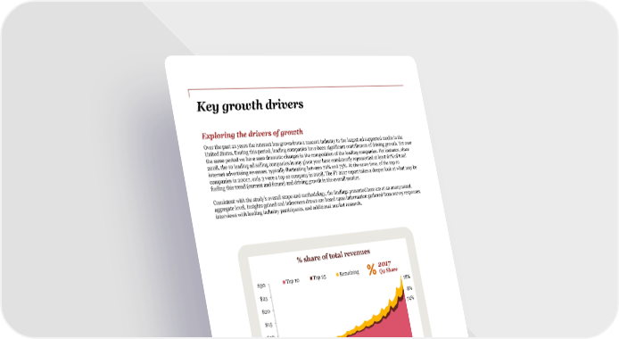Key growth drivers Exploring the drivers of growth Over the past 21 years the internet has grown from a nascent industry to the largest ad supported media in the United States. During this period, leading companies have been significant contributors of driving growth. Yet over the same period we have seen dramatic changes in the composition of the leading companies. For instance, since 2008, the 10 leading ad selling companies in any given year have consistently represented at least 67% of total internet advertising revenues, typically fluctuating between 70% and 75%. At the same time, of the top 10 companies in 20017, only 3 were a top 10 company in 2008. The FY 2017 report takes a deeper look at what may be fueling this trend (current and future) and driving growth in the overall market. Consistent with the study’s overall scope and methodology, the findings presented here are at an anonymized, aggregate level. Insights gained and inferences drawn are based upon information gathered from survey responses, interviews with leading industry participants, and additional market research. % share of total revenues $30 Top 10 Top 25 Remaining 2017 Q4 Share $25 18% $20 8% $15 74% $10 $5 $0 4 11 0 05 06 07 08 09 10 12 13 14 1516 17 20 20 20 20 20 20 20 20 20 20 2020 20 1720 20 PwC | IAB internet advertising revenue report 3