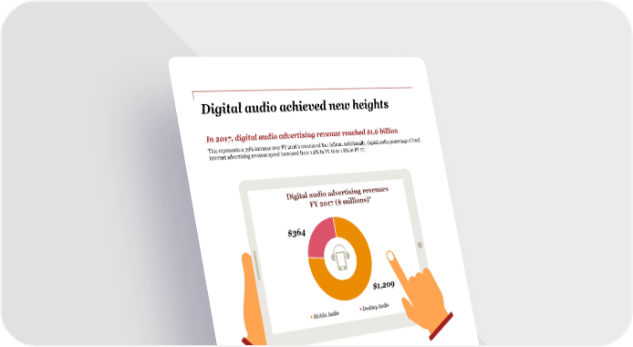 Digital audio achieved new heights In 2017, digital audio advertising revenue reached $1.6 billion This represents a 39% increase over FY 2016’s revenue of $1.1 billion. Additionally, digital audio percentage of total internet advertising revenue spend increased from 1.6% in FY 16 to 1.8% in FY 17. *Podcast advertising revenue is not included in the digital audio advertising revenue figures for FY 2016 or FY 2017. PwC | IAB internet advertising revenue report 16