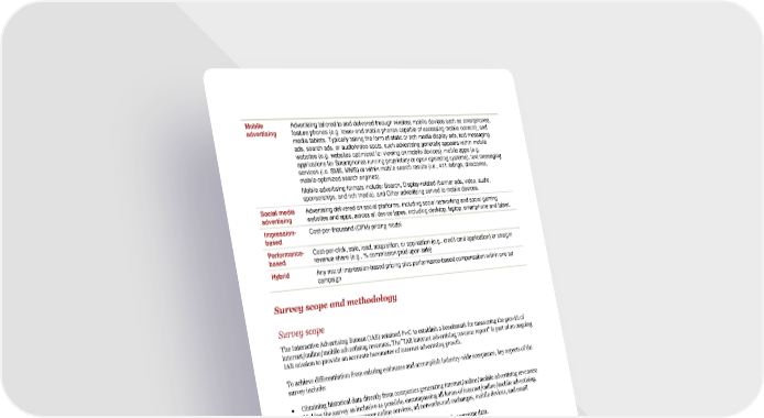 Mobile Advertising tailored to and delivered through wireless mobile devices such as smartphones, advertising feature phones (e.g. lower-end mobile phones capable of accessing mobile content), and media tablets. Typically taking the form of static or rich media display ads, text messaging ads, search ads, or audio/video spots, such advertising generally appears within mobile websites (e.g. websites optimized for viewing on mobile devices), mobile apps (e.g. applications for Smartphones running proprietary or open operating systems), text messaging services (i.e. SMS, MMS) or within mobile search results (i.e., 411 listings, directories, mobile-optimized search engines). Mobile advertising formats include: Search, Display-related (banner ads, video, audio, sponsorships, and rich media), and Other advertising served to mobile devices. Social media Advertising delivered on social platforms, including social networking and social gaming advertising websites and apps, across all device types, including desktop, laptop, smartphone and tablet. Impression- Cost-per-thousand (CPM) pricing model based Performance- Cost-per-click, sale, lead, acquisition, or application (e.g., credit card application) or straight based revenue share (e.g., % commission paid upon sale) Hybrid Any mix of impression-based pricing plus performance-based compensation within one ad campaign Survey scope and methodology Survey scope The Interactive Advertising Bureau (IAB) retained PwC to establish a benchmark for measuring the growth of internet/online/mobile advertising revenues. The "IAB internet advertising revenue report" is part of an ongoing IAB mission to provide an accurate barometer of internet advertising growth. To achieve differentiation from existing estimates and accomplish industry-wide acceptance, key aspects of the survey include: Obtaining historical data directly from companies generating internet/online/mobile advertising revenues; Making the survey as inclusive as possible, encompassing all forms of internet/online/mobile advertising, including websites, consumer online services, ad networks and exchanges, mobile devices, and email providers; and Ensuring and maintaining a confidential process, releasing only aggregate data. Methodology PwC performs the following: Compiles a database of industry participants selling internet/online and mobile advertising revenues; Conducts a quantitative mailing survey with leading industry players, including Web publishers, ad networks and exchanges, commercial online service providers, mobile providers, email providers, and other online media companies; Acquires supplemental data through the use of publicly disclosed information; Requests and compiles several specific data items, including monthly gross commissionable advertising revenue by industry category and transaction; Identifies non-participating companies and applies a conservative revenue estimate based on available public sources; and, Analyzes the findings, identifies and reports key trends. 24