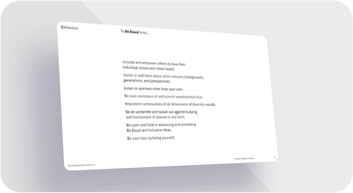 Behaviors To Be Equal is to… Include and empower others to have their individual voices and views heard. Invest in and learn about other cultures, backgrounds, generations, and perspectives. Listen to opinions other than your own. Be ever-conscious of and correct unconscience bias. Represent communities of all dimensions of diversity equally. Be an upstander and speak out against bullying and harassment of anyone in any form. Be open and bold in advancing and promoting Be Equal and inclusive ideas. Be your best by being yourself. Be Equal Brand Guide, Version 2.0 IBM Brand Experience & Design 10