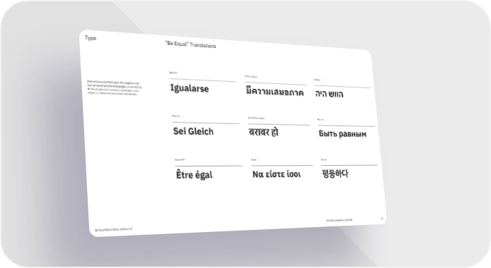 Type “Be Equal” Translations Spanish Thai (Looped) Hebrew International is our first name. Plex supports over one hundred international languages. In as much as Igualarse มีความเสมอภาค היה שווה Be Equal represents everyone, speaking in native tongue is a critical demonstration of inclusivity. German Hindi (Devanagari) Russian Sei Gleich बराबर हो Быть равным French??? Greek Korean Être égal Να είστε ίσοι 평등하다 Be Equal Brand Guide, Version 2.0 IBM Brand Experience & Design 33