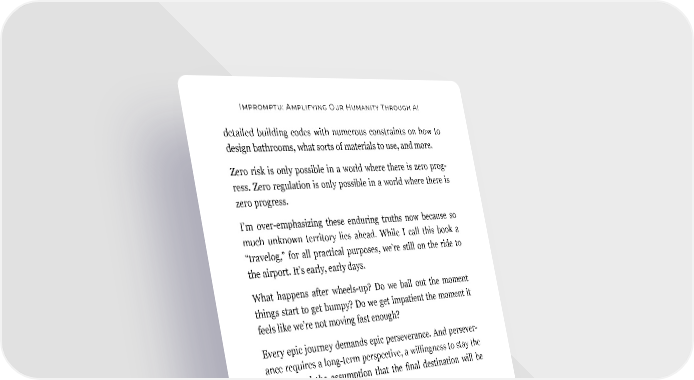 Impromptu: Amplifying Our Humanity Through AI detailed building codes with numerous constraints on how to design bathrooms, what sorts of materials to use, and more. Zero risk is only possible in a world where there is zero prog- ress. Zero regulation is only possible in a world where there is zero progress. I’m over-emphasizing these enduring truths now because so much unknown territory lies ahead. While I call this book a “travelog,” for all practical purposes, we’re still on the ride to the airport. It’s early, early days. What happens after wheels-up? Do we bail out the moment things start to get bumpy? Do we get impatient the moment it feels like we’re not moving fast enough? Every epic journey demands epic perseverance. And persever- ance requires a long-term perspective, a willingness to stay the course, and the assumption that the final destination will be worth everything it takes to get there. In building tools characterized in large part by their capaci- ties for speed, efficiency, and all-purpose virtuosity, it’s a little ironic, no doubt, to counsel patience and tolerate missteps. But think how easy it is, in the technologically magical world we now inhabit, where we acclimate to miracles so quickly, to lose sight of how long it took to achieve everything we now take for granted. At age fifty-five, I’ve lived 70 percent of my life without an iPhone. If you ask me what life was like when we didn’t all walk around with the world in our pockets, I can tell you. But I can’t really imagine it in any deeply felt way, because smart- 212