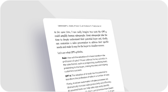 Impromptu: Amplifying Our Humanity Through AI At the same time, I can easily imagine how tools like GPT-4 could amplify human salespeople. Great salespeople take the time to deeply understand their potential buyer and, ideally, can customize a sales presentation to address their specific needs and make it easy for the buyer to visualize success. Let’s see what GPT-4 thinks. Reid: How will the adoption of AI tools transform the profession of sales? Please address the key activities in the sales funnel, such as prospecting, qualifying leads, presenting to the buyer, closing the deal, and helping customers succeed. GPT-4: The adoption of AI tools has the potential to transform the profession of sales in a number of ways. Firstly, AI-driven automation of sales processes can dramatically increase sales productivity and efficiency. AI-powered tools can help sales reps easily identify potential leads, qualify them, and prioritize them based on the likelihood of successful sales outcomes. AI-driven automation can also help sales reps quickly create com- pelling presentations tailored to their customer’s needs and preferences. In addition, AI-driven customer insights can be used to better understand customer behaviors, needs, and preferences to inform better sales strategies and tactics. AI-driven customer insights can also be used to person- alize sales pitches and better target customer segments. Finally, AI-driven tools can help sales reps close deals more quickly and effectively by providing timely insights into customer sentiment and helping sales reps identify the best time to reach out and close the deal. AI-driven tools can also help sales reps provide post-sale customer success by helping them anticipate customer needs and proactively reach out with helpful solutions. 122